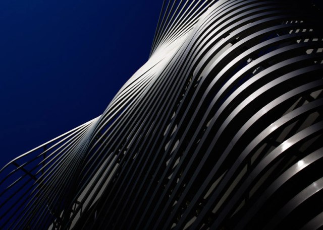 La fachada de este edificio comercial situado en Tokio, está recubierta por finas lamas de acero que lo envuelven y cuyas formas serpenteantes y onduladas, le dan un aspecto muy dinámico.