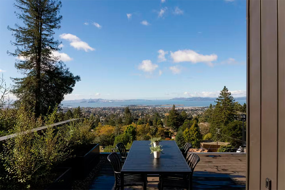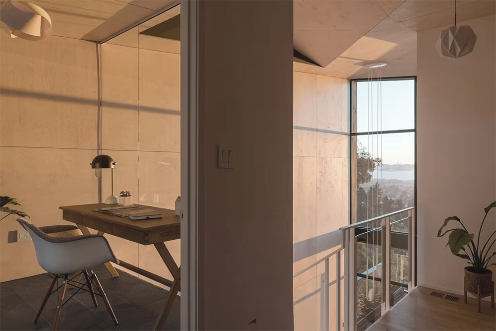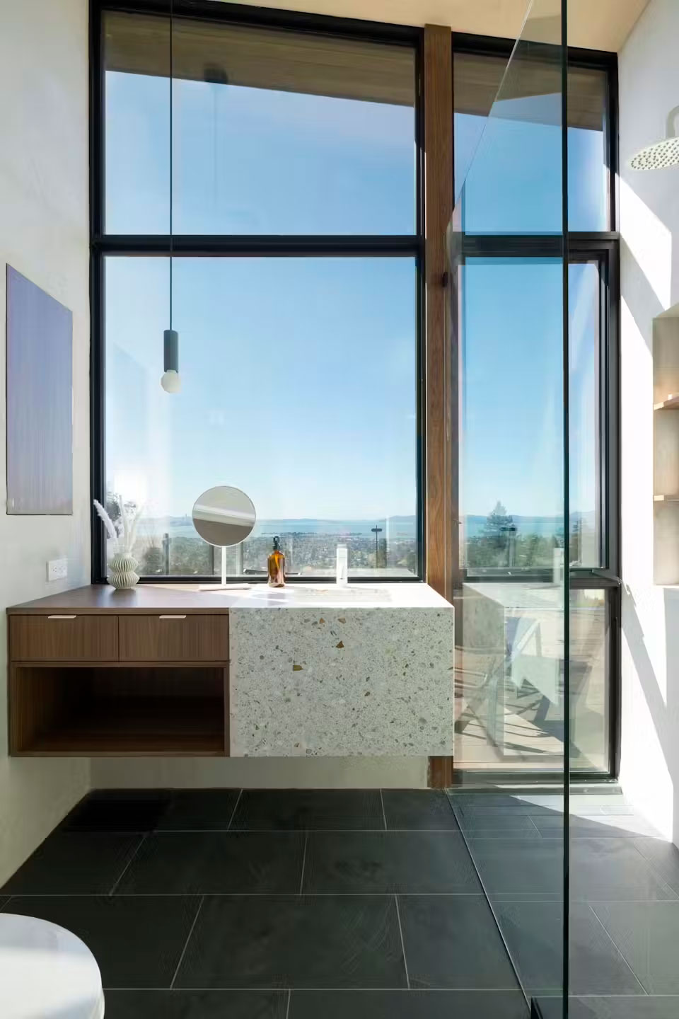 La fachada principal, prácticamente acristalada y orientada al oeste, ofrece unas vistas inmejorables. Desde las estancias principales se alcanza a ver San Francisco y el Golden Gate, y esa relación visual constante con el paisaje transforma la percepción del interior. No es una casa cerrada hacia dentro, sino un espacio que respira horizonte.