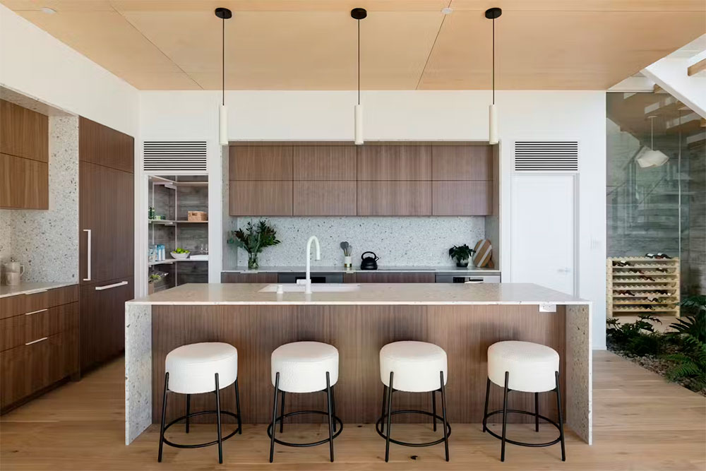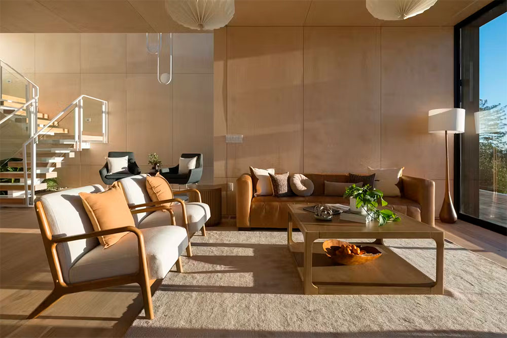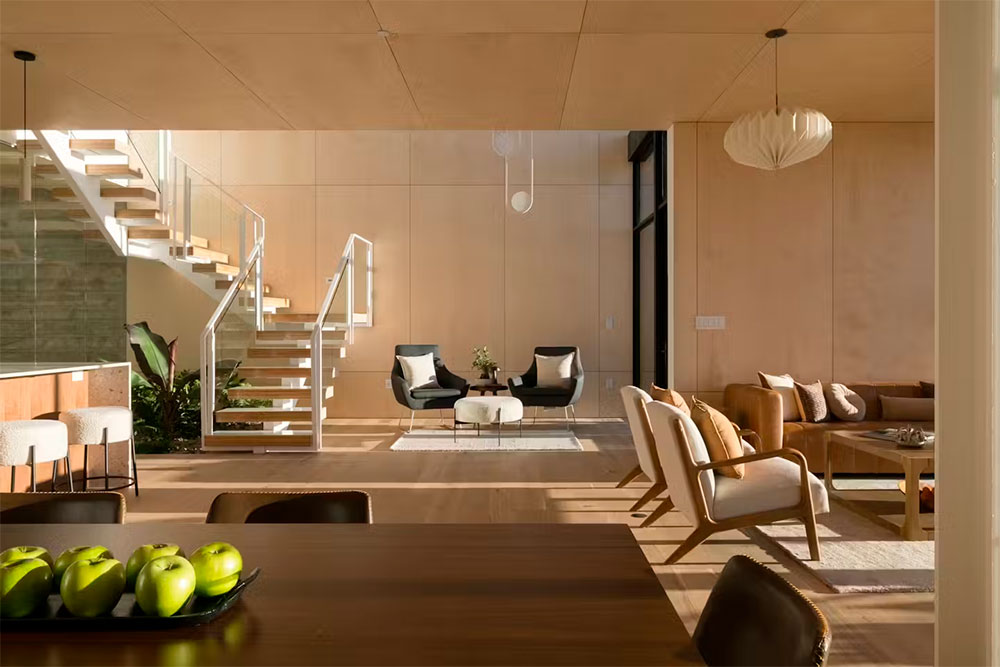Otro aspecto especialmente relevante es su planteamiento energético. La casa funciona de forma totalmente eléctrica e incorpora paneles solares con batería de almacenamiento, bombas de calor de alta eficiencia y preinstalación para vehículo eléctrico. Además, la estructura ha sido diseñada teniendo en cuenta la normativa sísmica de la zona, algo imprescindible en California. No se trata solo de estética; hay una reflexión técnica y responsable detrás.