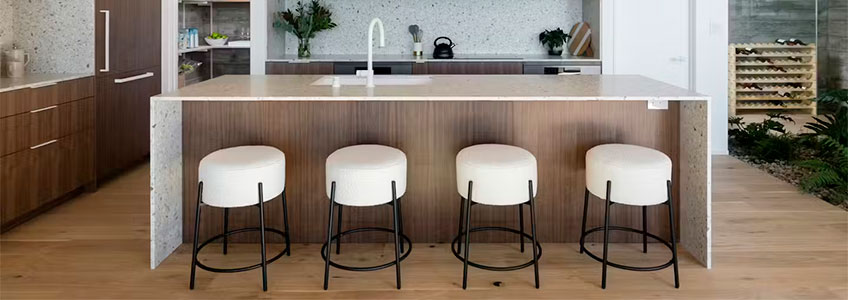 En cuanto a los materiales, la vivienda combina acabados duraderos y una paleta sobria que no distrae de lo esencial: espacio y paisaje. La cocina, integrada en la zona principal, mantiene esa coherencia formal con líneas depuradas y soluciones discretas de almacenamiento. Todo está pensado para que la arquitectura sea la protagonista, no el mobiliario.