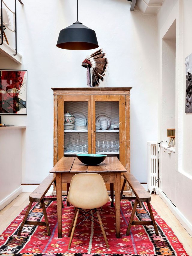 7.- ¿Cómo, un comedor completo con mesa y cuatro sillas por algo más de 300€? Pues en Kenay Home lo tienes, monísimo para un salón pequeño o una cocina con office. Aunque me quedo con el look completo, la alfombra de fibras, la lámpara y la estantería String.