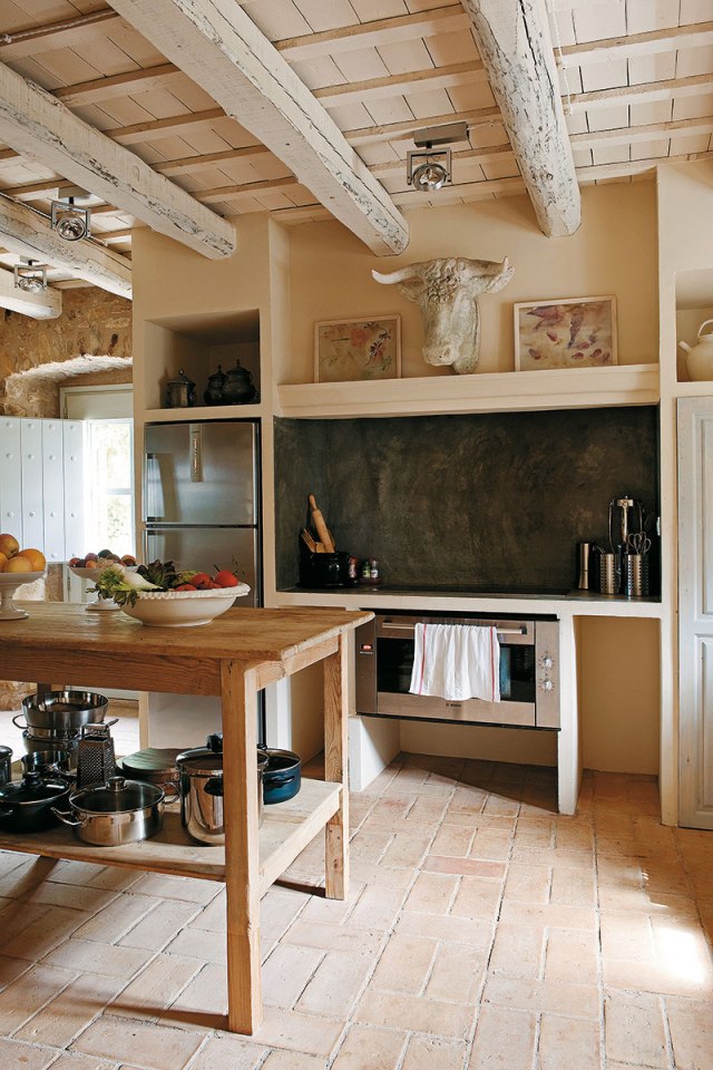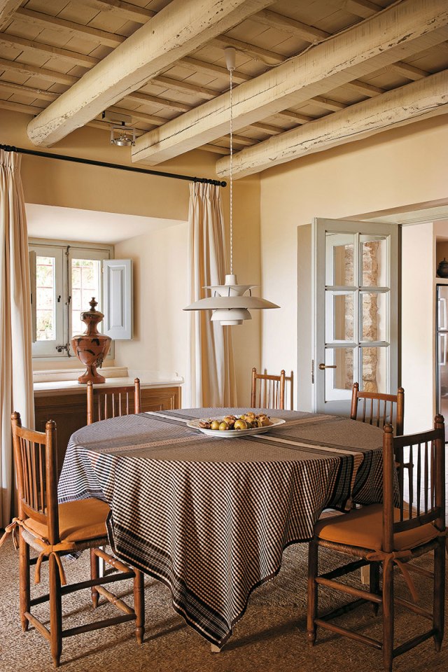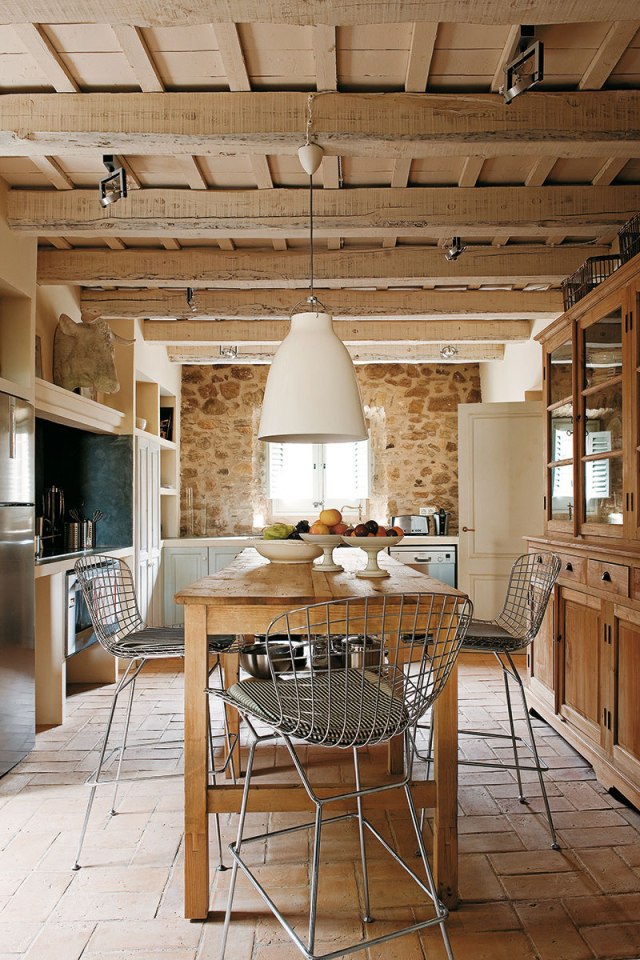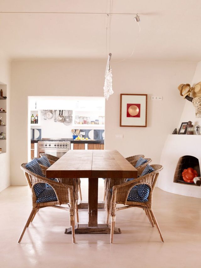 La casa de mediados del siglo pasado sigue teniendo sus dos pisos originales. Se enfocaron en los acabados, como la gran cantidad de piedra cubierta por lechada blanca y sobre ella, un sellador de hormigón de alta calidad que, la interiorista ya había utilizado en otros proyectos y era una idea que propietarios querían replicar. Llegaron también toques de contraste como el revestimiento de la chimenea del salón, son láminas de acero oxidado que hacen que el espacio parezca más antiguo de lo que es en realidad. O el banco de obra que recorre la pared de la zona del comedor y que fue recubierto por cemento de la marca SureCrete.