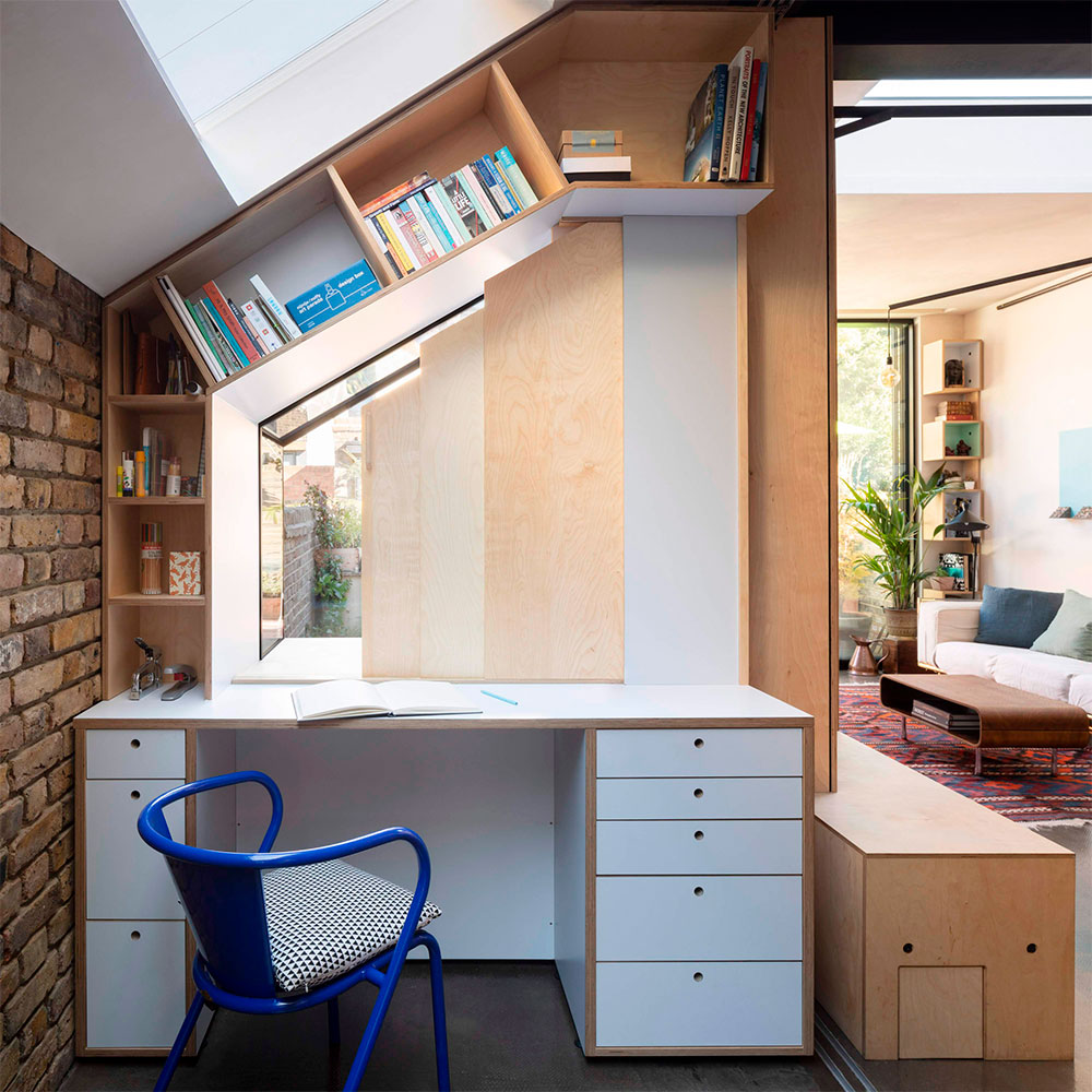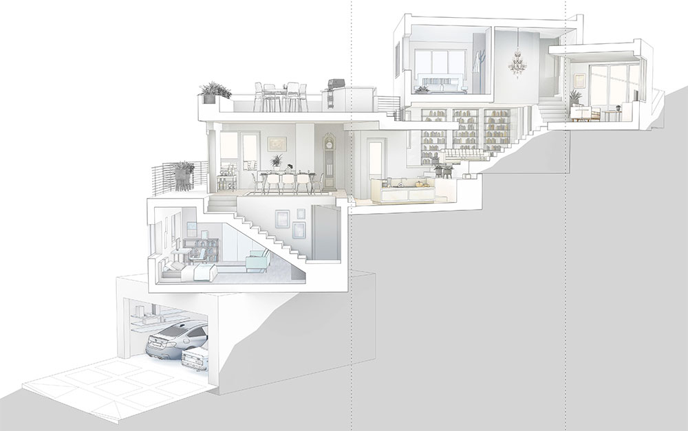 La casa se desarrolla en tres plantas sobre un terreno de terrazas inclinadas. En la planta media (la de acceso) encontramos la cocina, el comedor, un dormitorio y un baño. En la superior, el dormitorio principal con baño en suite y una gran terraza exterior. Por último, la plata baja cuenta con dos dormitorios más (uno con literas para los niños) y un baño compartido.