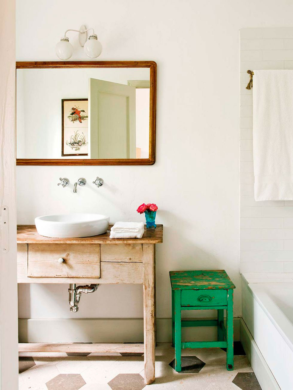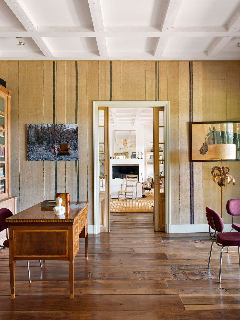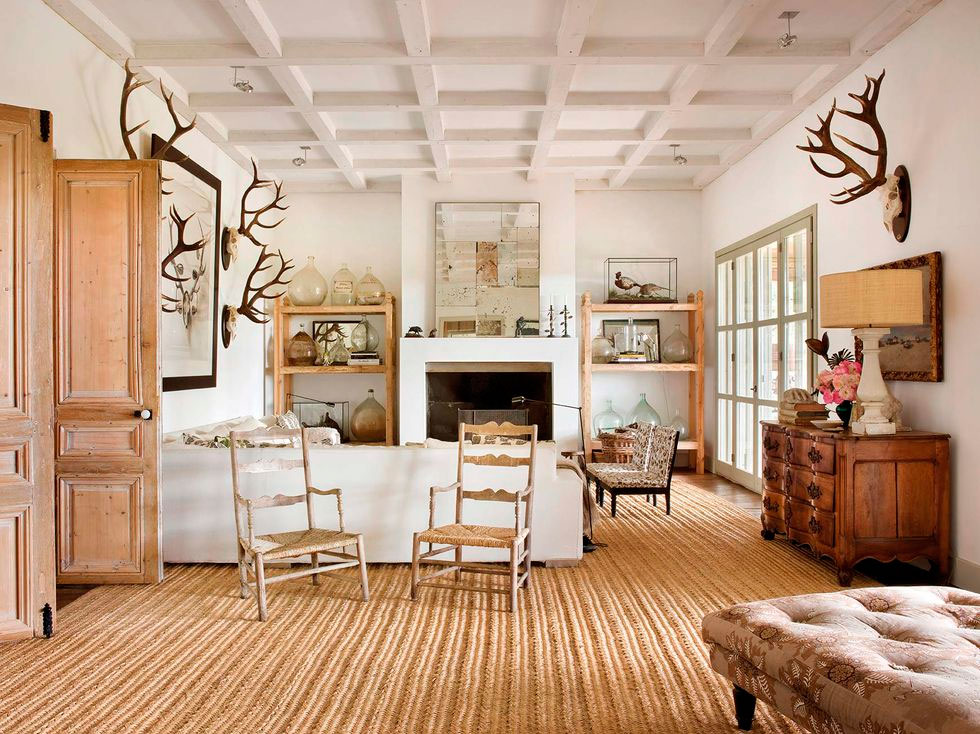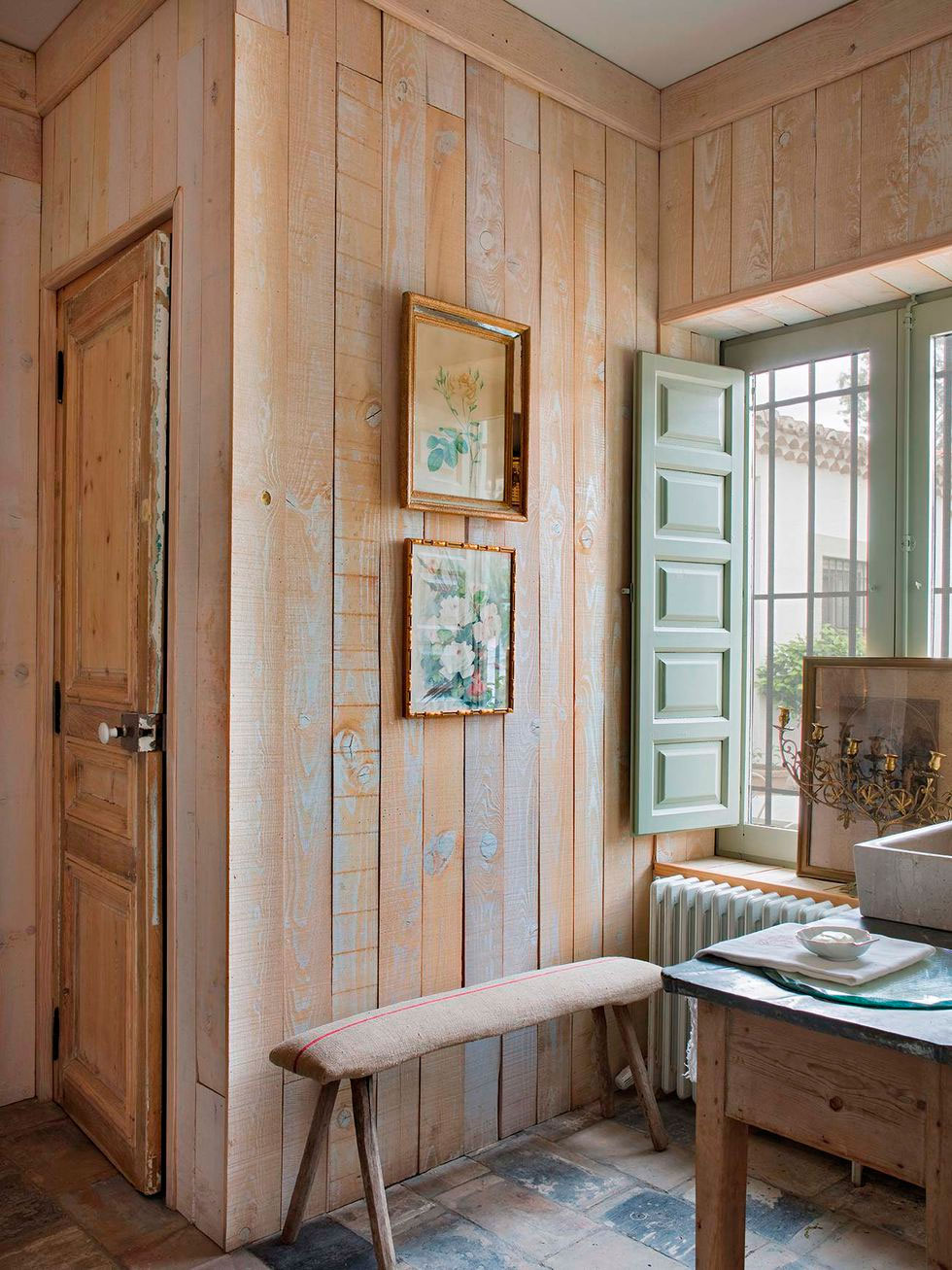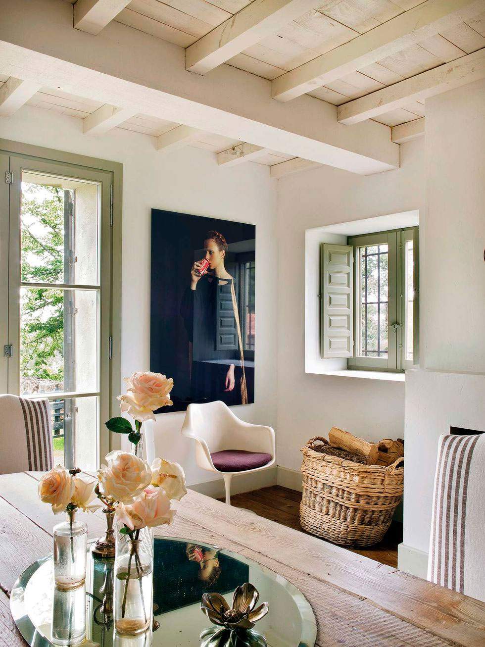 Por toda ella discurre una misma gama cromática, los tonos tierra y los grises se extienden por todo el espacio, sólo interrumpidos por un bonito rosa en el cuarto infantil. La madera es la gran protagonista con sus techos a dos aguas y viguería vista, que bien podría simular una casita de cuento, en ella todo invita al recogimiento. En el interior se mezclan piezas rústicas como la mesa del comedor y los taburetes, con otras más contemporáneas como el sofá o la iluminación del salón, y luminarias mid-century en el dormitorio, con otras piezas más especiales como la bañera o el lavabo del baño realizados por completo en cemento, o piezas de diseño como el espejo Half Moon Mirror de Ben & Aja Blanc de la entrada. Al final encontramos un conjunto en perfecta armonía, precisamente por lo que os comentaba, porque sigue una misma gama cromática que ayuda a ver el espacio como un «todo».