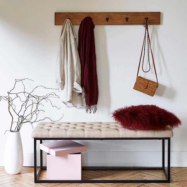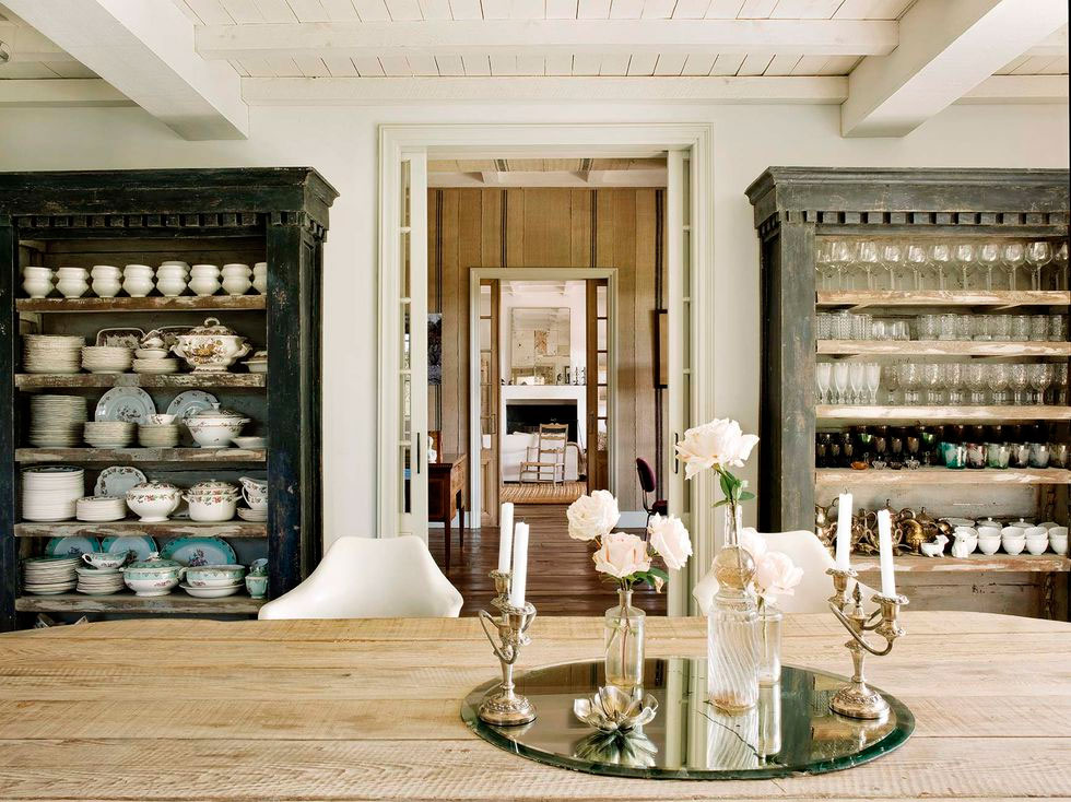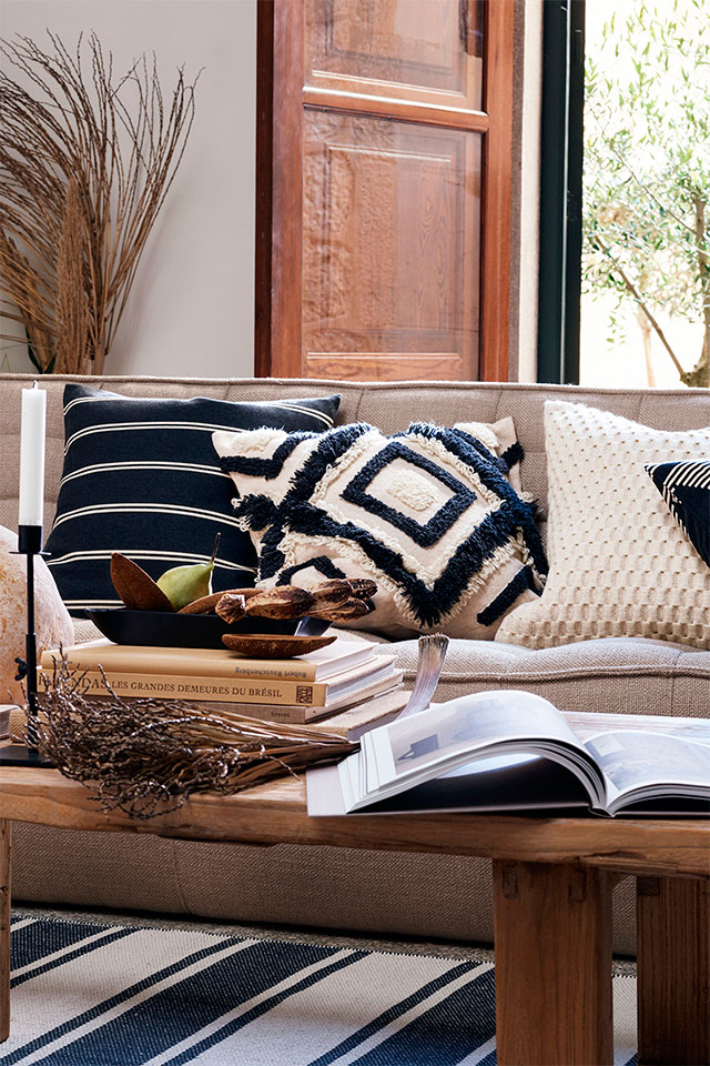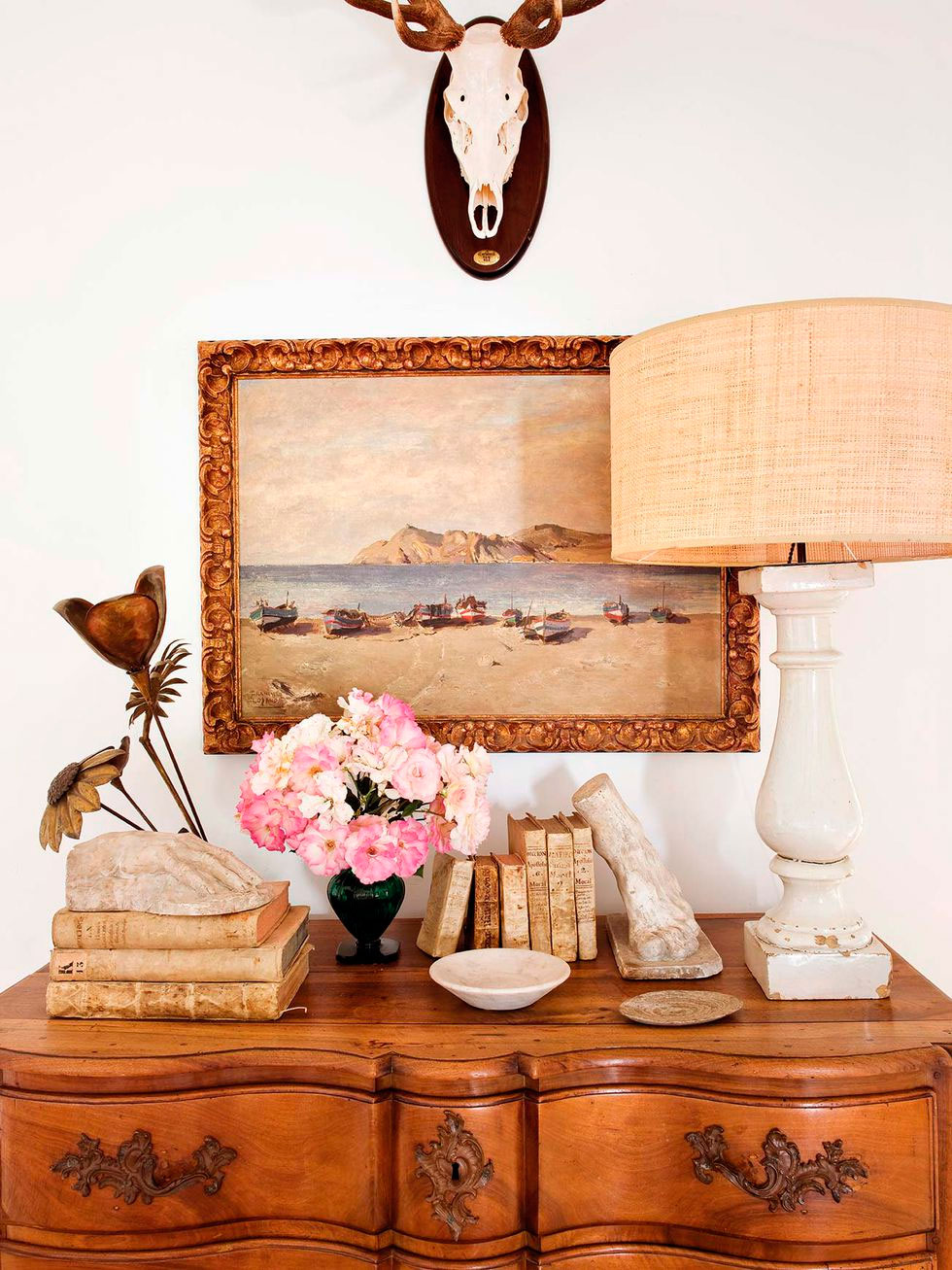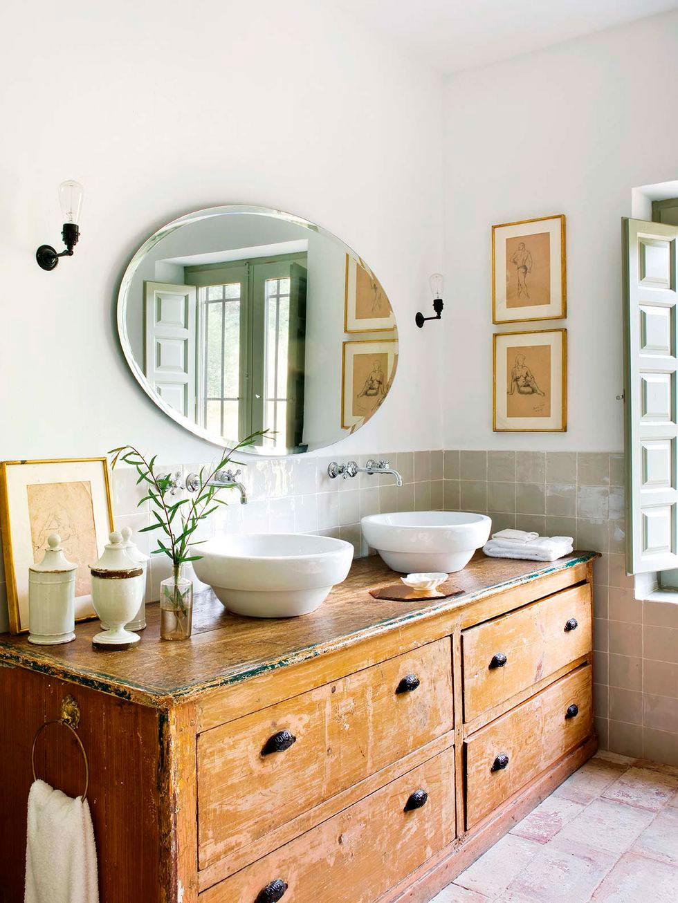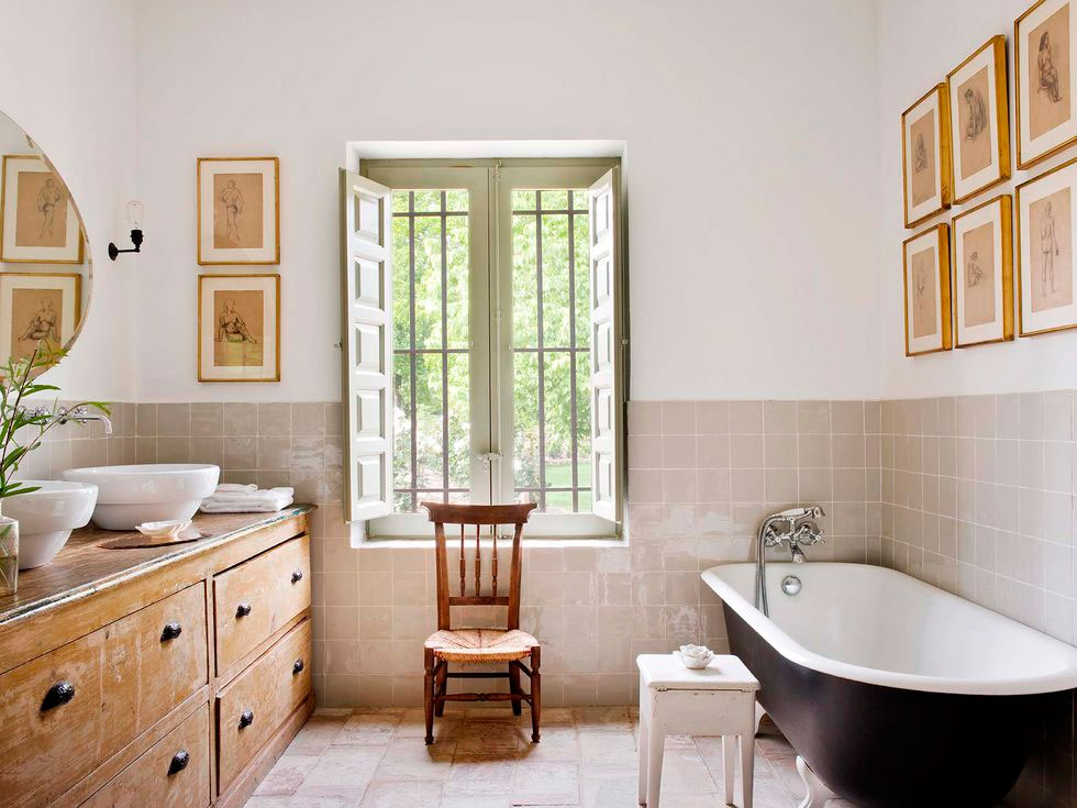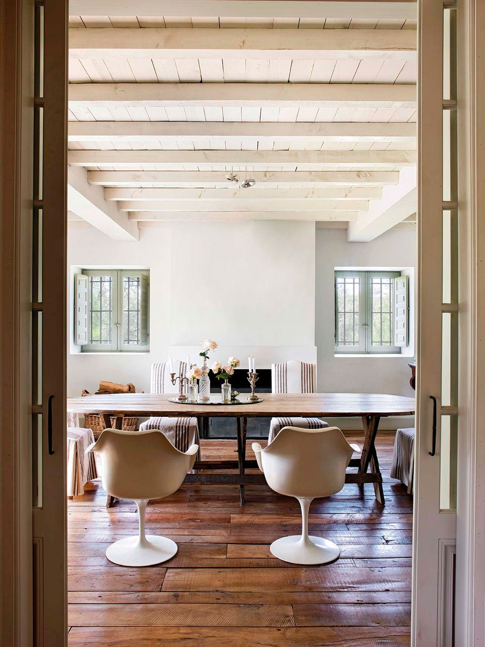 Por toda ella discurre una misma gama cromática, los tonos tierra y los grises se extienden por todo el espacio, sólo interrumpidos por un bonito rosa en el cuarto infantil. La madera es la gran protagonista con sus techos a dos aguas y viguería vista, que bien podría simular una casita de cuento, en ella todo invita al recogimiento. En el interior se mezclan piezas rústicas como la mesa del comedor y los taburetes, con otras más contemporáneas como el sofá o la iluminación del salón, y luminarias mid-century en el dormitorio, con otras piezas más especiales como la bañera o el lavabo del baño realizados por completo en cemento, o piezas de diseño como el espejo Half Moon Mirror de Ben & Aja Blanc de la entrada. Al final encontramos un conjunto en perfecta armonía, precisamente por lo que os comentaba, porque sigue una misma gama cromática que ayuda a ver el espacio como un «todo».