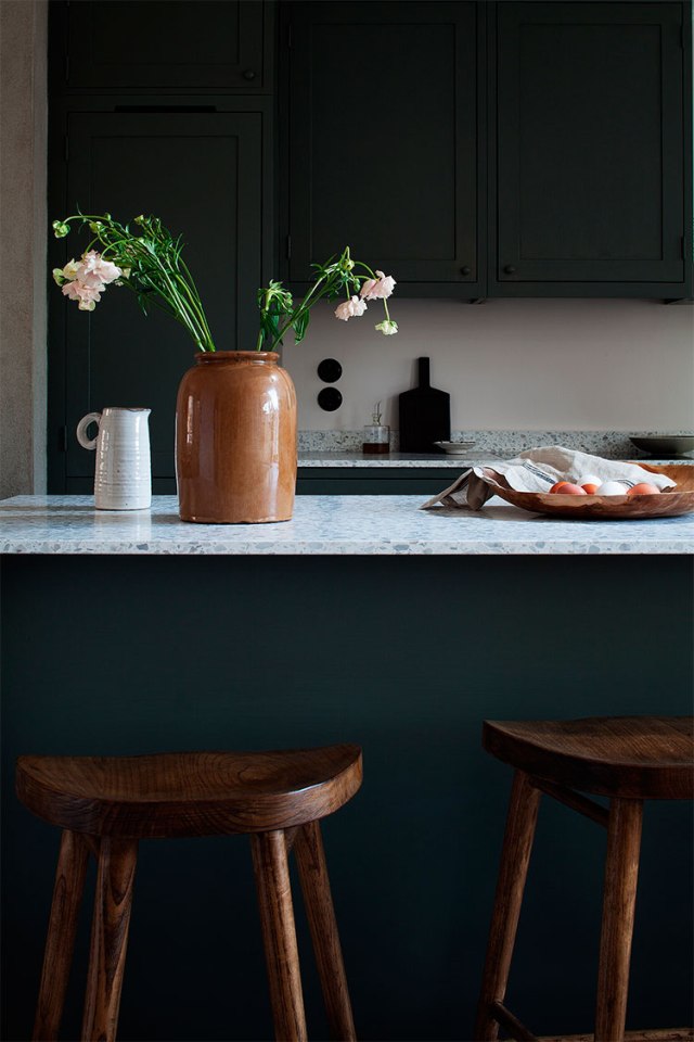 Álex no se limitó a supervisar: participó activamente en la reforma, poniendo en práctica las enseñanzas de carpintería que aprendió de su padre. Cada material, cada textura, fue escogida con mimo, priorizando lo natural y lo artesanal. La cocina, diseñada bajo el concepto de loft, cuenta con una espectacular isla de Silestone de Cosentino, lámparas de Liderlamp y un extractor a la vista que aporta un toque industrial.