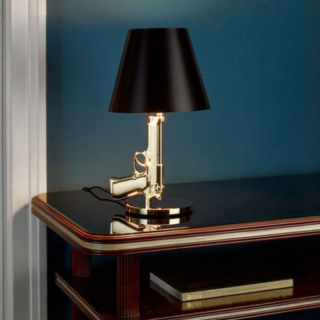 Tengo sentimientos encontrados respecto a la lámpara GUNS de Flos, diseño de Philippe Starck. Realmente creo que no sería una pieza que elegiría para mí, pero tiene su gracia ¿no? y se ha conseguido colar entre las más deseadas. La base es de aluminio fundido a presión con acabado en oro de 18K, aunque también la hay en versión plateada.