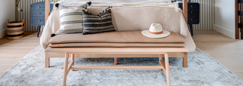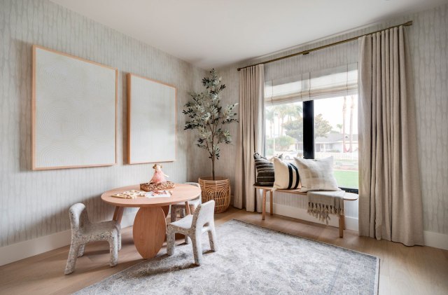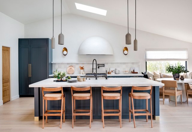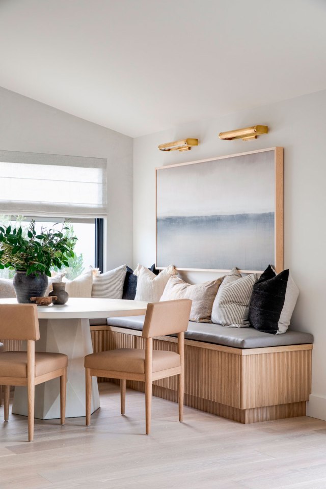 Bajo el ventanal de la cocina, encontramos una gran zona de comedor, con banco a medida, todo el conjunto está realizado en roble. Lo completan unas colchonetas en color verde, a tono con los muebles de la cocina y la vegetación exterior, y tres lámparas de Le Petit Florilèg.