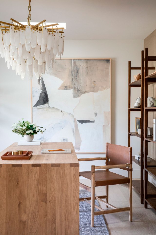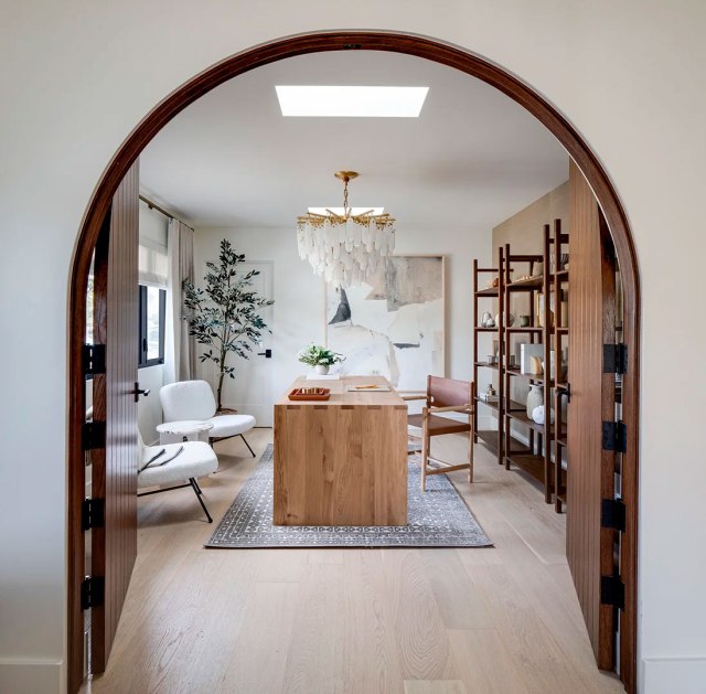 Contiguo a la cocina, se ha diseñado un pequeño espacio de trabajo en un bonito azul grisáceo combinado con madera. Está hecho a medida mezclando líneas curvas y rectas, un diseño que le aportan dinamismo y funcionalidad. Además de la oficina, tras un separador de ambientes de barrotillos de madera, se ha realizado también una zona de vestíbulo con armarios, perchero, zona para los zapatos, etc. siguiendo la misma gama cromática.