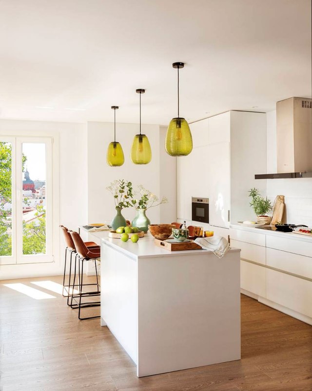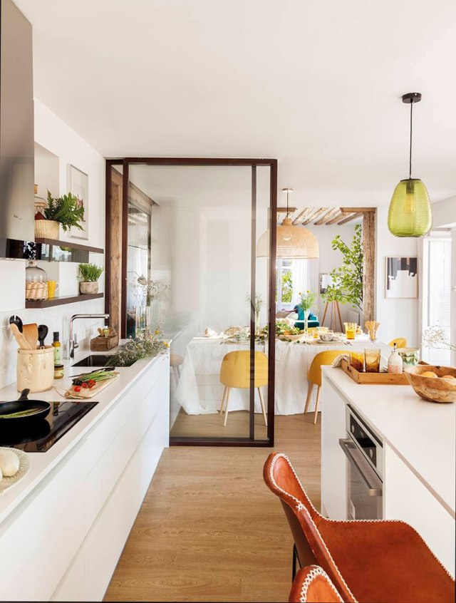 En la antigua vivienda, cocina y salón estaban separados en dos habitaciones distintas, decidieron tirar la pared que separaba ambos espacios para que quedaran conectados. La cocina además tiene puerta acristalada con salida al jardín y esa misma pared de la puerta, en su parte superior, no está cerrada, sino que lleva cristal, por lo que la iluminación natural está asegurada. En el salón, instalaron también una nueva puerta acristalada en forma de acordeón que asegura más luz en esta estancia, antes insuficiente para todas las plantas de interior, además mejora el acceso al patio trasero.