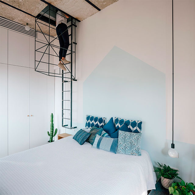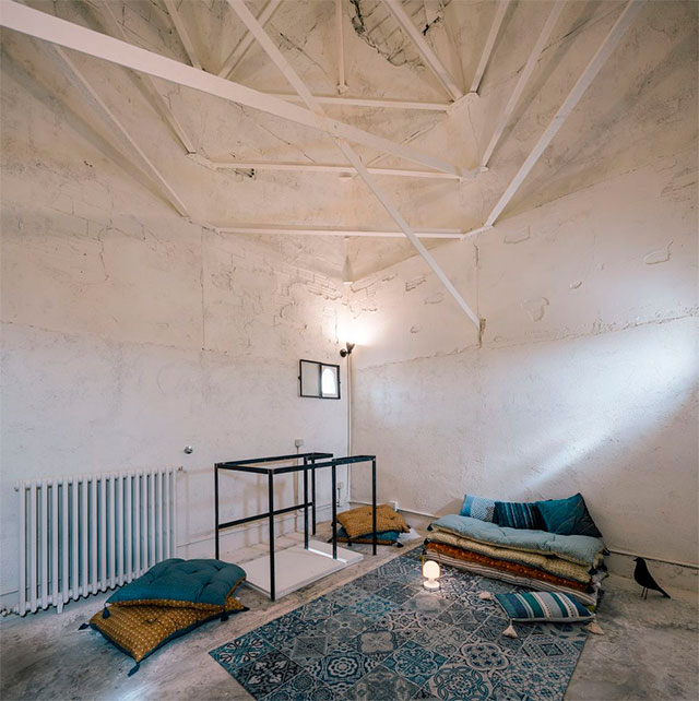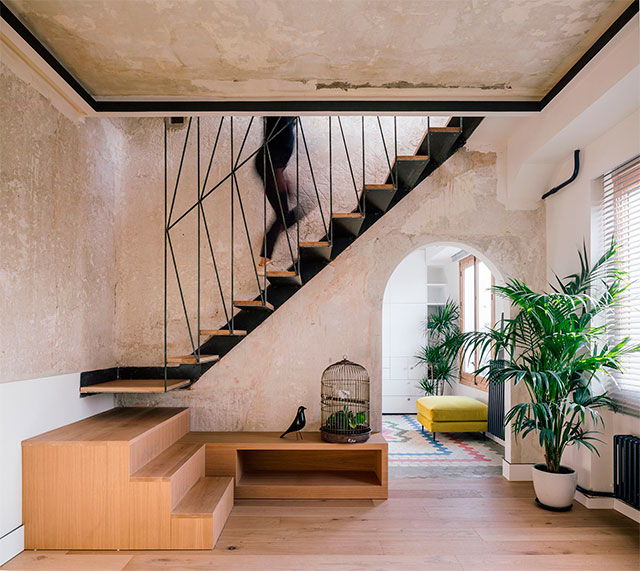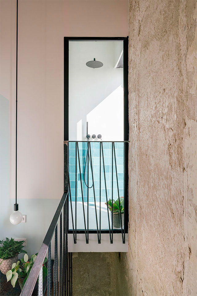 La casa, se encuentra en un antiguo secadero de pimientos, en la provincia de Cáceres. Como he dicho, Guille dejó que el espíritu de la misma sobreviviera, de ahí sus muros de piedra a la vista, conviviendo con paredes lisas o contraventanas recuperadas, para luego meter cierto contraste con los cerramientos de aluminio en negro, o las escaleras de hierro de corte fabril, las fibras naturales en los muebles (como los sillones de ratán del salón, o la alfombra de fibra, que proceden de Ikea), etc.