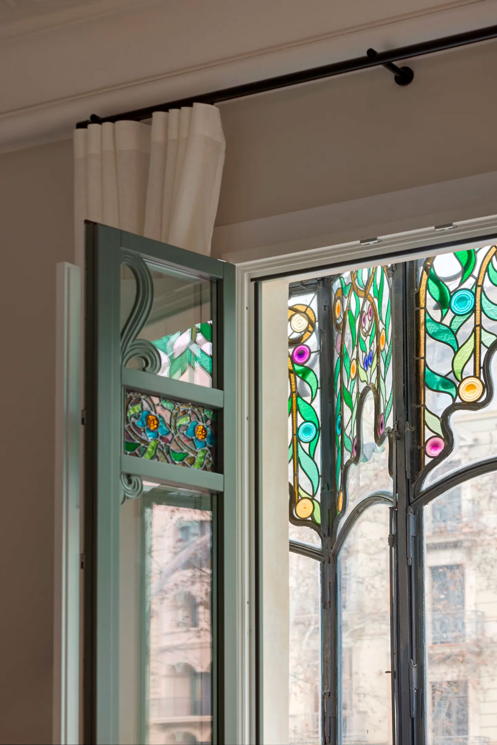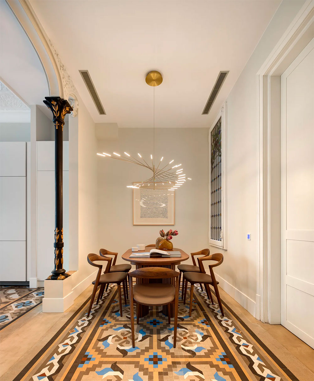 Y llegamos a bellas intervenciones en cuanto a diseño interior se refiere, como el piso que os traigo hoy realizado por LUV Studio. Uno de los aspectos clave fue la preservación de los detalles originales del edificio, como los techos altos, las molduras decorativas y los suelos de mosaico hidráulico. LUV se esforzó por mantener la esencia modernista del edificio, restaurando estos elementos y dándoles un papel protagonista dentro de los nuevos diseños. buscó un equilibrio entre la estética modernista de la Casa Oller y las necesidades contemporáneas de los nuevos residentes. Esto se tradujo en un uso de materiales modernos y acabados que complementaban los elementos originales sin restarles importancia. Por ejemplo, se introdujo mobiliario y acabados minimalistas que respetaban las líneas arquitectónicas modernistas. El estudio, se enfocó en crear espacios interiores más funcionales y en potenciar la entrada de luz natural, gracias a la disposición estratégica de particiones de vidrio y materiales reflectantes. El resultado fue una mejor conexión entre las distintas áreas de las viviendas, favoreciendo un estilo de vida más acorde con los tiempos actuales. Por último, pero no menos importante, introdujeron conceptos de sostenibilidad haciendo un uso eficiente de la energía y recursos.