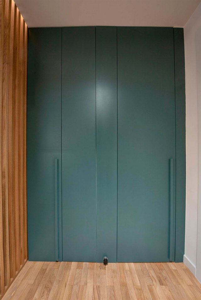 Hay otros detalles que destacan, como el vano en forma de arco de la entrada, que hace las veces de banco para descalzarse al llegar a casa, con gaveta inferior para poder guardar el calzado. Hace además de división entre el salón y el recibidor, de una manera original y sutil. Aunque quedaría menos estético, perfectamente podría llevar además, una balda para poder colgar los abrigos (el dilema de siempre, estética versus funcionalidad).