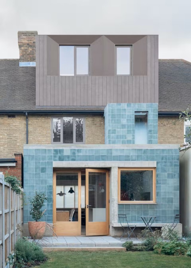 Vista desde el patio trasero, puede contemplarse cómo los mosaicos azules han ido perdiendo color con la exposición al sol, haciendo que cambie la estética de la casa, e incluso que se transforme con las distintas estaciones. El color y la textura de los azulejos, contrasta con los ladrillos del resto de la fachada típicamente londinenses.