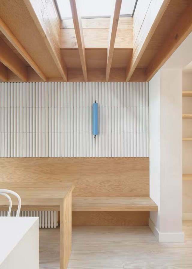 La mesa hecha de tablas de abeto Douglas, va acompañada de un banco de la misma madera, sobre éste se ha decorado la pared con cerámica blanca acanalada creando un contraste muy interesante.