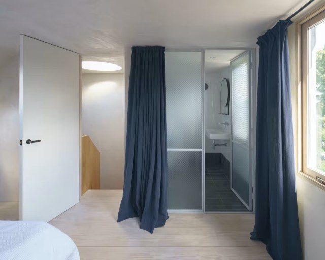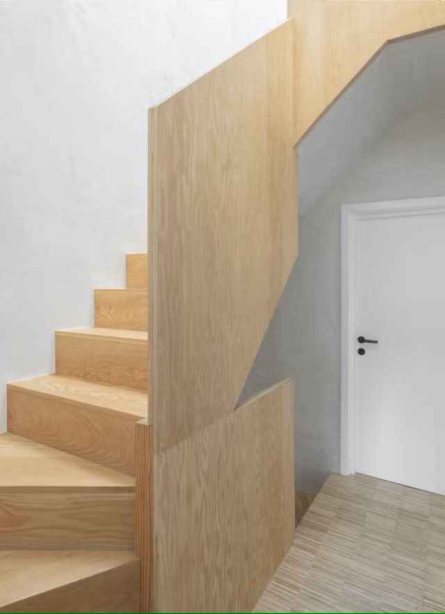La escalera de la misma madera, está fabricada de manera escultórica haciendo referencia a los trabajos de Alvar Aalto. Por ella se asciende al ático, espacio que se destinó a la suite principal de la casa, con un aspecto más que minimalista. Poco más que una cama y un espejo cumplen su función, le acompaña el baño acristalado al que se le han añadido unas bonitas cortinas azules que le dotan de privacidad.