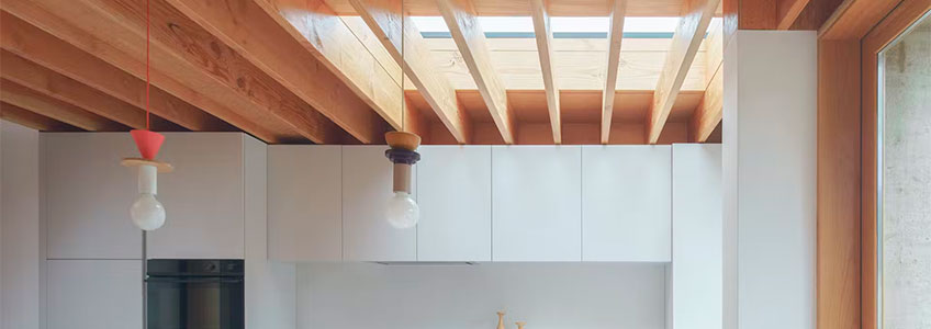 En estas dos estancias, al igual que las vigas del techo, los muebles y el suelo también son de madera de abeto, proporcionando continuidad y contrastando con los muebles y la encimera de cuarzo en blanco brillante, de Caesarstone. Sobre la mesa de comedor, la mítica lámpara de Louis Poulsen y las originales luminarias colgantes sobre la encimera, son de Schneid Studio. El área de la cocina lleva un suelo de terracota más sufrido, y tras la isla, donde se encuentra la zona de comedor, pasa a ser de madera de abeto.