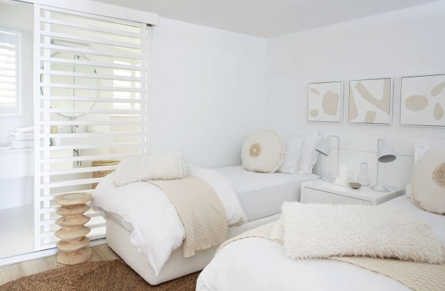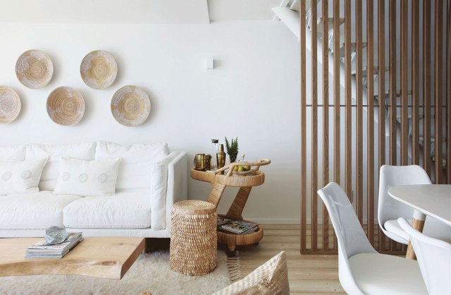 Lo que hizo la interiorista fue complementar el trabajo del arquitecto. La finca se compone básicamente de tres elementos: madera, piedra y yeso. La decoración siguió esa misma paleta de color añadiendo telas que complementaran y suavizaran el conjunto, también otras que recordaran los colores de la isla, como el mostaza, el verde oliva o el aguamarina. Apostó también por las texturas y el mobiliario de calidad, como la teca del jardín que apenas necesita mantenimiento y envejece muy bien.
