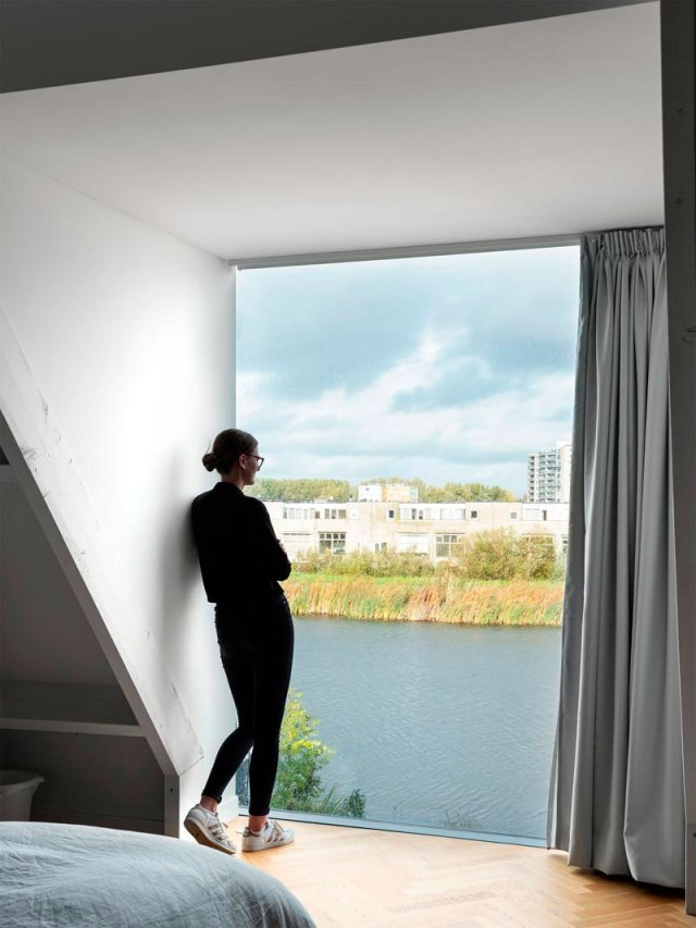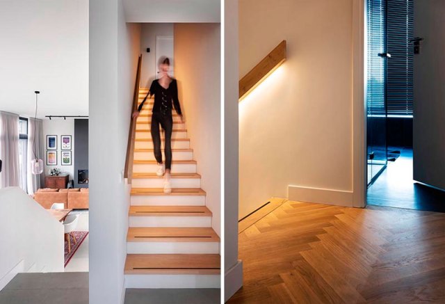 Para la sala de estar, el comedor y la cocina, se ha elegido la madera como protagonista, aunque en esta última se ha colocado un antepecho en color negro para proteger la zona de cocinar, que hace juego con la carpintería metálica de las ventanas. Posiblemente sea una sensación óptica mía a causa de las fotos, pero la mesa de comedor me resulta algo pequeña respecto a las grandes dimensiones del espacio, como si sus proporciones no fueran las correctas ¿no os da la misma sensación?
