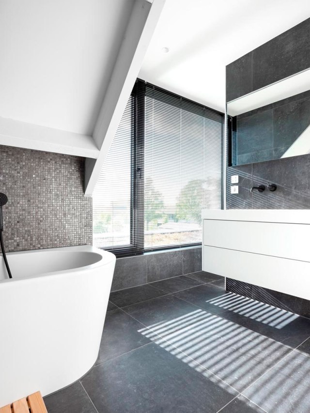 Un segundo baño, sigue el mismo patrón que el baño principal, sólo que en este caso el lavabo sólo tiene un seno y se ha apostado por un gran armario para disponer de mucho almacenaje. Y todavía hay un tercero, con una pila volada, griferías encastradas en negro (al igual que el resto de la casa), pero esta vez en lugar de armario, nos encontramos con una estantería abierta donde lucen adornos de decoración, algunas revistas o pequeños cuadros.
