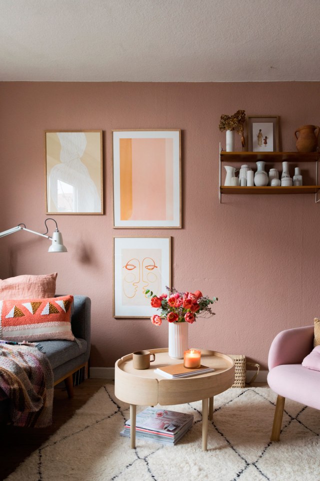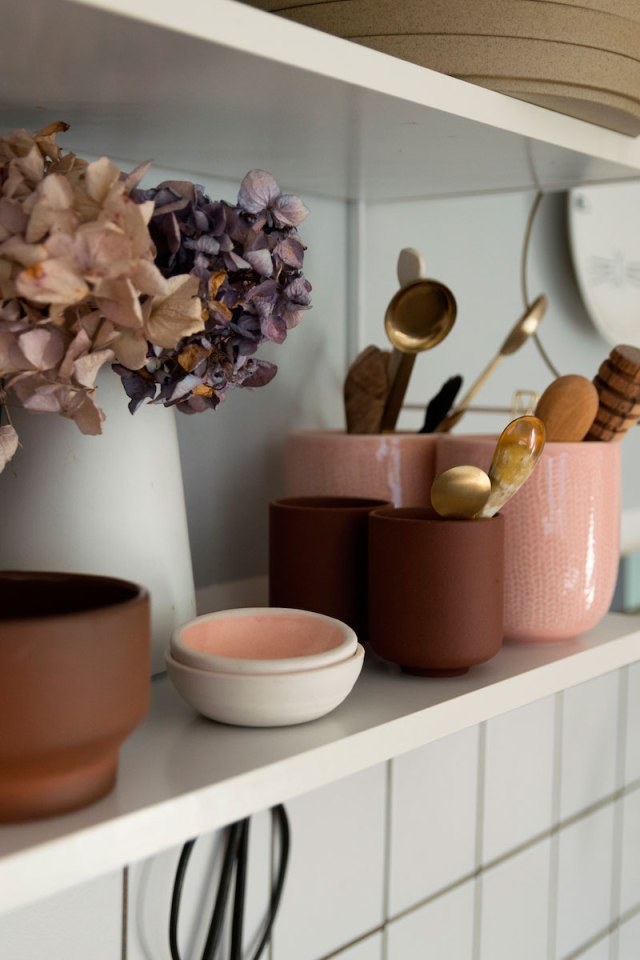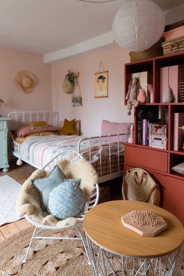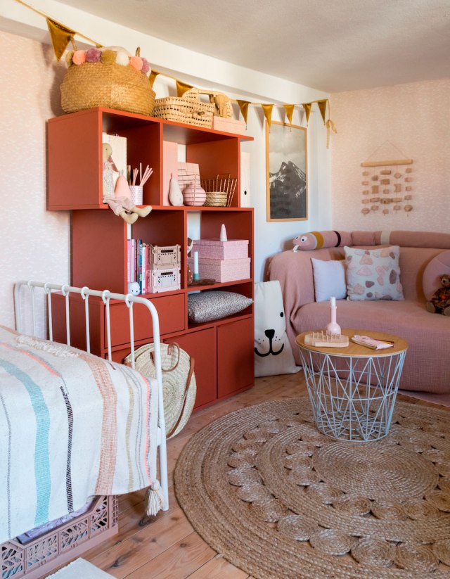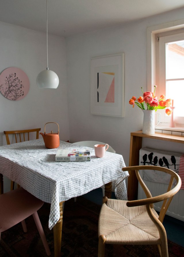 Como os decía no es una casa cien por cien para mí, pero sí me quedo con ideas. La primera el uso del color, quizás penséis: demasiado rosa, pero trasladad esto mismo a colores neutros ¿a que ya no cansaría tanto? Me quedo también con el estilismo de las estanterías abiertas, porque si vas a tener preciosas estanterías «String» por todas partes (entre otras), por lo menos que estén ordenadas. Me encantan los suelos en madera natural, con sus nudos y sus vetas y que los muebles, también tengan este tipo de tonos claros para no recargar. Me quedo con el comedor, sencillo y dinámico, con cada silla de «su padre y de su madre». Y me quedo con los textiles y la forma de mezclarlos, unos lisos, otros con texturas, los distintos tonos,… hacen conjuntos perfectos.