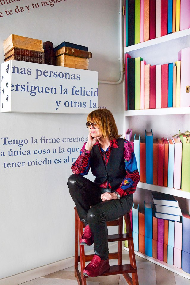 La alfombra y el sofá, con terciopelo de Designers Guild, proceden de su tienda y las mesitas son el modelo Gong de Capellini. La lámpara del salón es de Flos. El divertido mueble auxiliar rojo, que sirve de apoyo al sofá, es de Fornasetti. Destacan los detalles industriales como la lámpara articulada Jieldé y el armario de hierro.