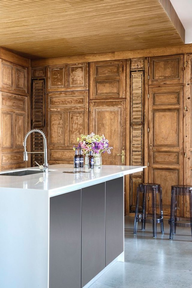 Muchos de los elementos que decoran la casa, tanto a nivel arquitectónico como decorativo, tienen procedencia marroquí. Los azulejos de los baños son un ejemplo, también los pavimentos que recorren parte de los suelos, o la sucesión de platos azul índigo que se descuelga por la pared del vestíbulo.