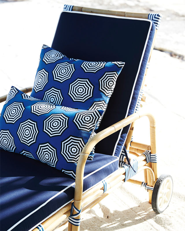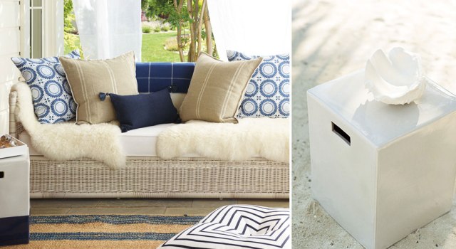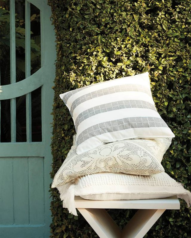 Y tras la cocina, una puerta nos da paso a un porche con un idílico comedor exterior. Madera, fibras, vegetación e incluso, una cornucopia barroca, conviven en él a la perfección. Este patio es el que divide la zona de día (salón, cocina, comedor) de la más privada (los dos dormitorios y el baño). Aquí, se han dejado las paredes originales y las han vestido con mucha vegetación, alrededor de la cual, una piscina alargada pone la guinda del pastel a esta bonita zona exterior.