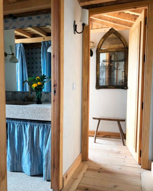 Para aprovechar el desnivel del terreno, está dividida en dos alturas y dos naves. En la planta superior encontramos tres dormitorios dobles, uno de ellos en una nave y los otros dos, en la otra. El primer dormitorio, el de matrimonio, cuenta con cama de 160 cm, vestidor y baño en suite, además de un cuarto de estar donde hay un sofá cama adicional. Los otros dos dormitorios son dobles, con camas individuales, aunque en uno también hay un altillo con dos colchones extra. Ambas habitaciones comparten un baño completo.