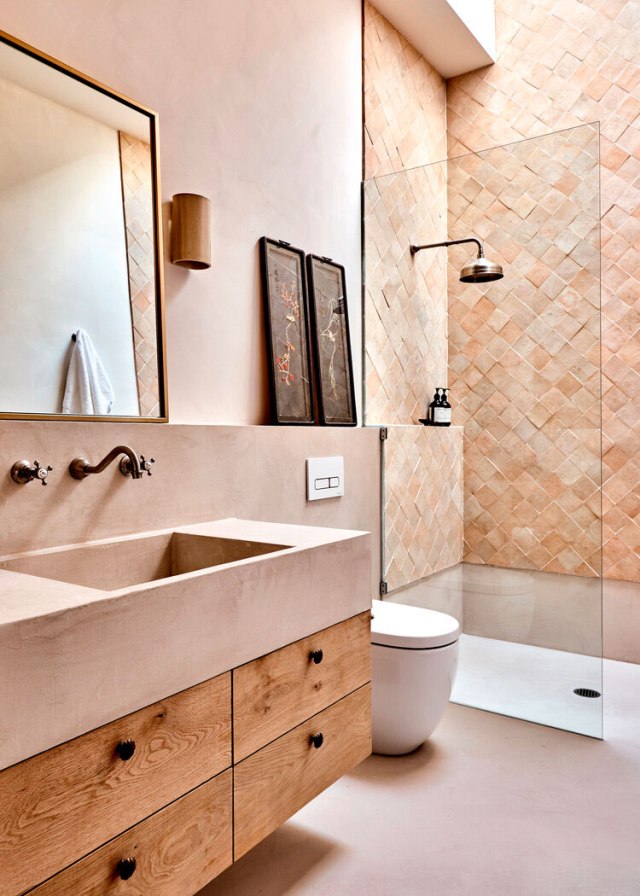 En los baños, todos los azulejos pertenecen a las distintas colecciones de Tiles of Ezra y los muebles están hechos en madera reciclada de roble macizo, contrastan a la perfección con las griferías de Brodware.