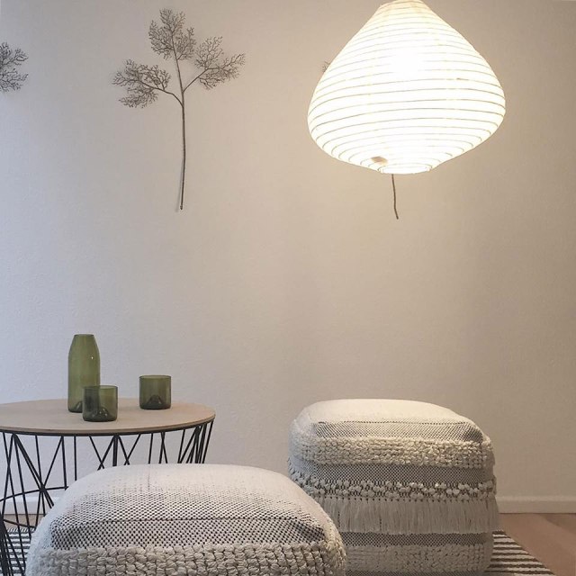 Para la decoración se han elegido elementos de madera natural (incluidos los suelos), hormigón en un tono neutro, alfombras de fibras, cortinas de lino, complementado con grises, verdes, marrones cálidos… todas estas tonalidades y materiales hacen referencia a al entorno campestre en que se encuentra la vivienda. Pero lo rústico o campestre, no está reñido con el diseño, en el salón encontramos piezas como el sillón Bohemian´72 de Gubi , o las mesitas auxiliares de DWR, el sofá Leonard de líneas curvas de Few & Far, la butaca Cuoio Walterm de Knoll y la gran lámpara colgante Nelson Ball Bublle de HAY.