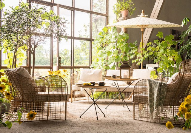 Todas las zonas comunes son abiertas y comparten espacio, además, con doble altura, lo que las hace más luminosas y la sensación es de total amplitud. Además de la cocina, el comedor y el salón nos encontramos con un añadido, el espacio estrella, ese que tanto me ha enamorado, una especie de jardín de invierno, cerramiento, o invernadero, podéis llamarlo como queráis, cuyo techo y paredes acristaladas hace que la sensación sea de estar en el exterior cuando en realidad, se puede disfrutar incluso en pleno invierno y con lluvia. Su suelo porcelánico tipo hidráulico, lo hace especialmente sencillo de mantener. Como os decía antes, podría tener mil usos, pero en este caso quienes más lo disfrutan son las mascotas de la casa y las plantas, aunque seguro que en esa mesita estratégicamente colocada, algún que otro café contemplando el paisaje y al calor del sol del invierno, habrán pasado momentos de completo relax (y si no lo han hecho, les falta un tornillo).