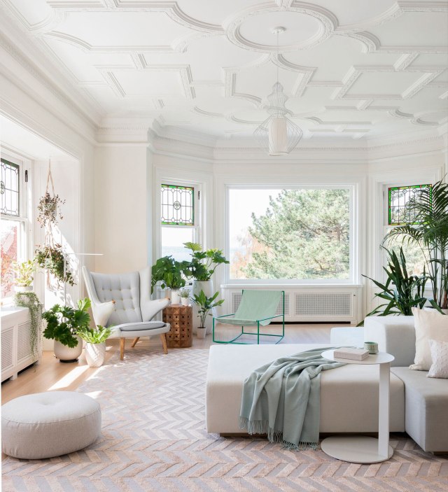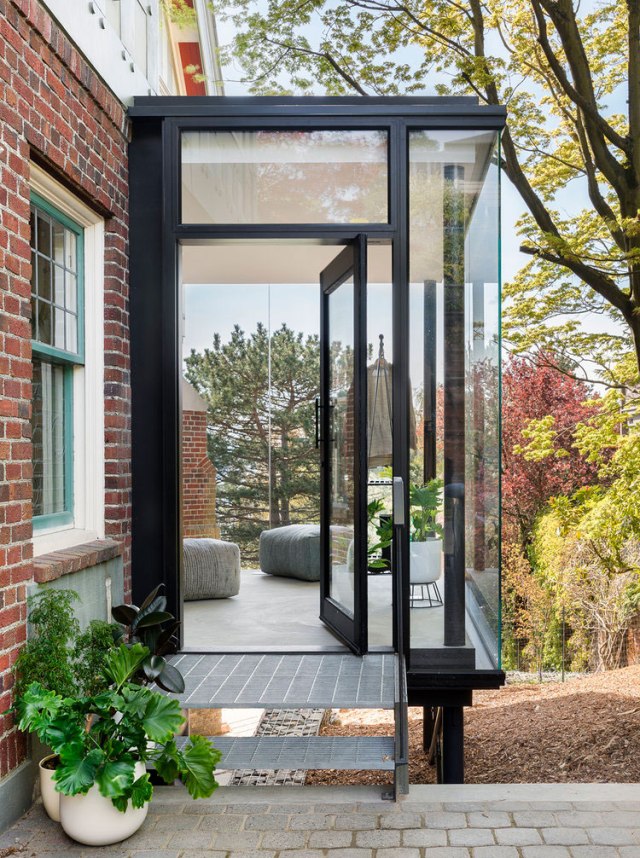 Os traigo para empezar esta belleza de 1915, con la que tengo ciertos sentimientos encontrados. Las obras de remodelación se llevaron a cabo por DeForest Architects y el interiorismo pertenece al estudio NB Design Group. Nada más entrar se aprecia el contraste entre la antigua edificación de ladrillo y el añadido que se realizó como nueva entrada de la casa, a modo de porche acristalado, que lo inunda todo de luz. Me encanta cómo se ha resuelto el espacio con un simple perchero con zapatero incorporado, muy útil para dejar abrigos y zapatos al llegar. Un puf hace las veces de descalzador y el toque de las plantas le da sensación de confort a una gama cromática en negros y grises. Por cierto un acierto el suelo de cemento en la entrada para facilitar la limpieza.