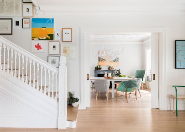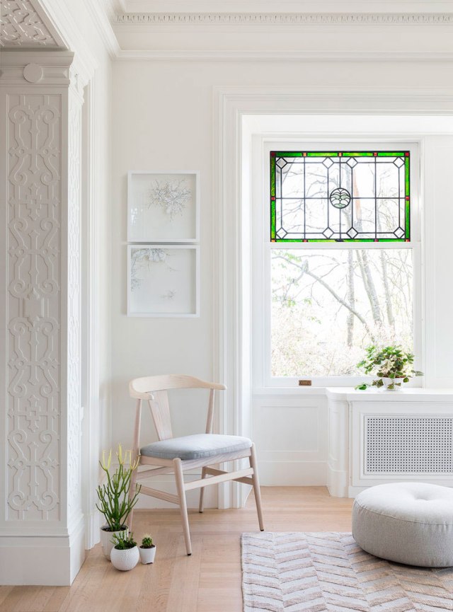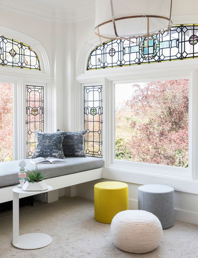 Ya en el interior, se han respetado los suelos de madera y las carpinterías antiguas, pero se han pintado de blanco para aumentar la sensación de amplitud, incluidas puertas correderas, columnas de madera tallada o la barandilla de la escalera. El toque de color y la guinda del pastel de esta vivienda, al menos en mi opinión, son las vidrieras. De ahí que el mobiliario, sea en su mayoría en tonos neutros. Podemos ver también cómo en muchas ventanas se han añadido butacas, sillas o bancos, para poder disfrutar de las vistas del jardín, que por cierto, tampoco tiene desperdicio.