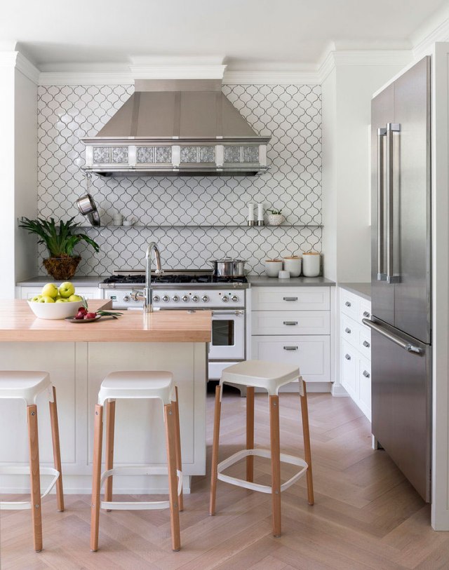 La cocina combina el aire clásico de la casa con los materiales modernos que se han introducido para darle contraste, como el acero inoxidable, la lechada oscura que remarca los azulejos, la gran campana,… y en la isla, se ha utilizado una encimera de madera, que tiene su réplica en el suelo y le resta frialdad al acero.