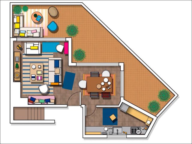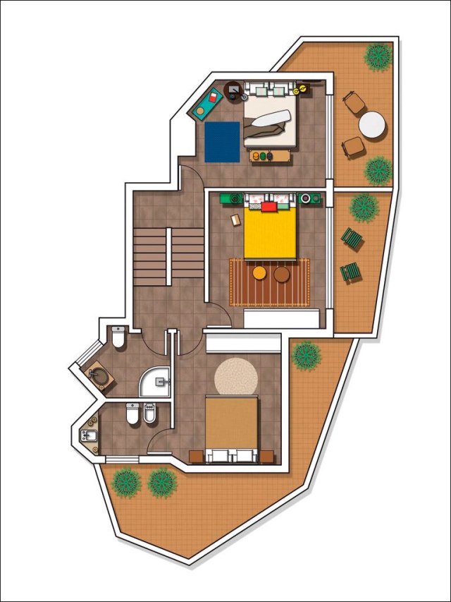 La casa se desarrolla en tres plantas sobre un terreno de terrazas inclinadas. En la planta media (la de acceso) encontramos la cocina, el comedor, un dormitorio y un baño. En la superior, el dormitorio principal con baño en suite y una gran terraza exterior. Por último, la plata baja cuenta con dos dormitorios más (uno con literas para los niños) y un baño compartido.