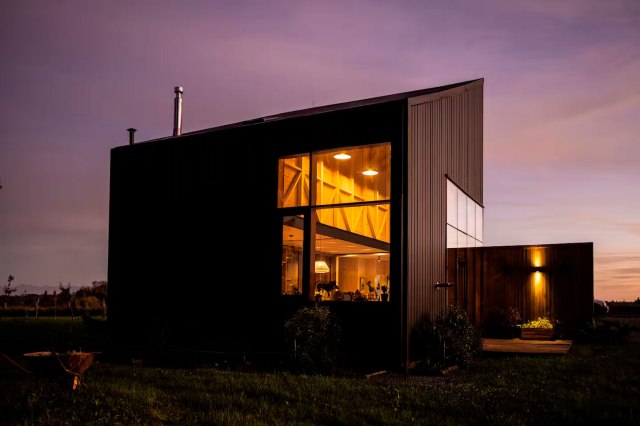 Las simetrías juegan un papel importante, cocina, salón y cuarto de estar se alinean dando a la planta principal continuidad y los grandes cerramientos de cristal permiten comunicar el interior y el exterior a demanda. Elementos como la chimenea del salón, pueden ser utilizados también por su cara exterior, pudiendo disfrutar de ella por el porche exterior.