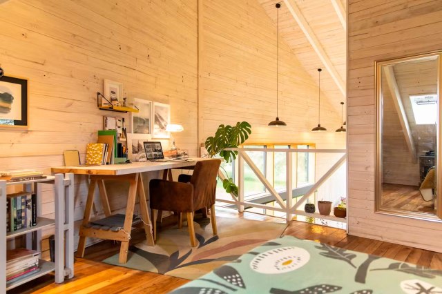 Al igual que la planta baja está concebida para el uso y disfrute en familia, la primera planta es todo lo contrario, se busca privacidad. El dormitorio principal ha copiado la idea del salón y su chimenea puede disfrutarse tanto desde la habitación como desde la ducha, doble confort. Cuenta además, con otros dos dormitorios que comparten baño completo. En esta planta, encontramos una habitación más que hace las veces de despacho y zona de juegos.