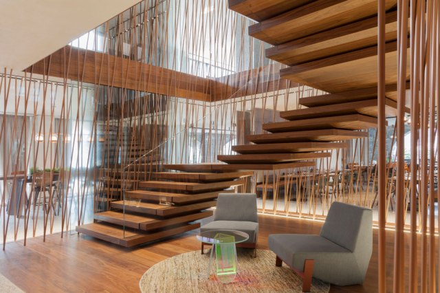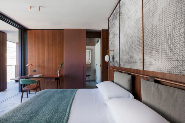 A medida que pasamos de una habitación a otra, las texturas naturales y los elementos sin tratar se hacen más presentes, fijaos en la curiosa estructura de la barandilla de la escalera realizada con cuerdas en zig-zag, o la simpleza de la lámpara del dormitorio realizada también con una gruesa cuerda y una bombilla desnuda (me encanta cómo queda). Ambos son recursos simples pero a la vez de gran impacto visual.