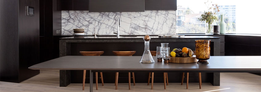 La cocina y el office son todo un remanso de paz. En la cocina sólo resalta la luminaria de Apparatus bajo toda esa madera lavada. Y en la zona de desayunos, se ha construido un banco bajo la ventana con el mismo tipo de madera, completándolo con una mesa redonda y sillas Dordogne de Charlotte Perriand. La lámpara, también negra como la de la cocina, es de Savoy de Huniford.