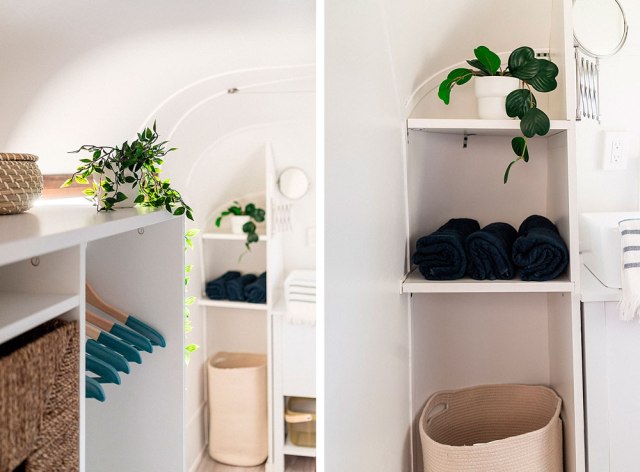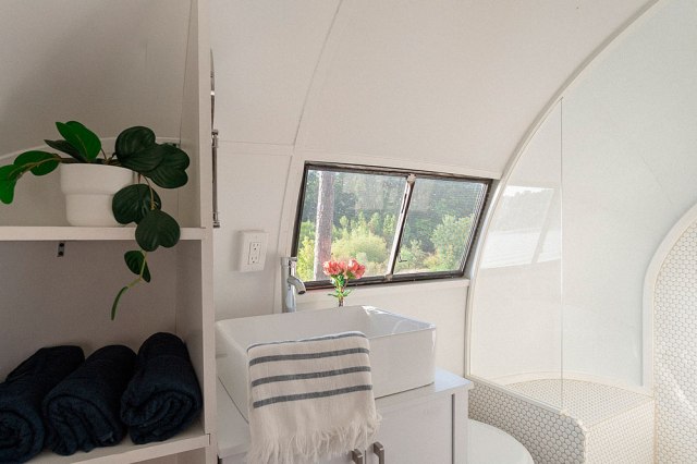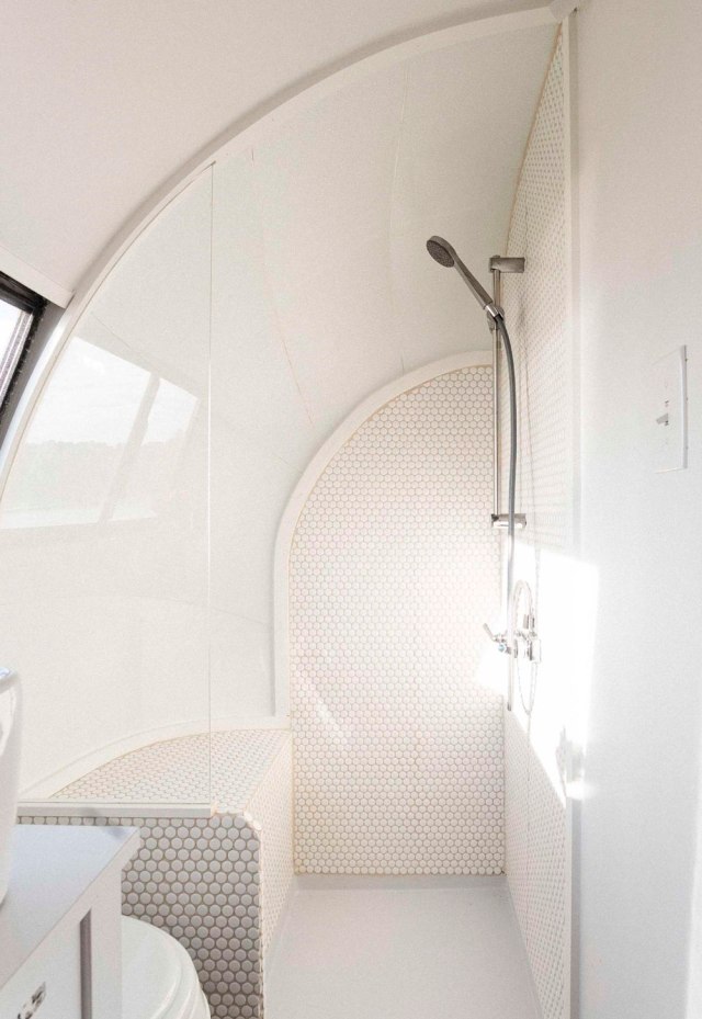 Y llegamos al extremo, para encontrarnos con el baño, sin duda el más completo que he visto nunca en una caravana. ¿No os habéis fijado que normalmente la ducha y el inodoro comparten un mismo espacio? Siempre he pensado lo poco práctico que es esto, ya que es imposible ducharte sin mojar el resto. Sin embargo es la primera vez que veo que cada pieza tiene su lugar, una ducha independiente (además la propia forma de la caravana ha permitido hacer un banco en su parte redondeada, lo que me parece súper práctico), tiene la zona de lavabo que se ha aprovechado con un pequeño mueble con almacenaje y cestas en su parte inferior y a su lado también, una pequeña estantería sirve para colocar más enseres de baño, toallas, etc. Entre la ducha y el lavabo se encuentra el inodoro. Vaya, que he visto casas que no tienen un baño tan completo.