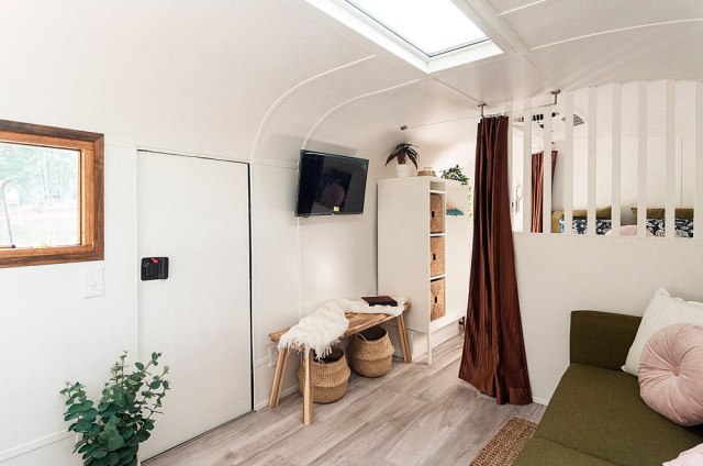 Según entramos disponemos de un banco de madera con cestos de mimbre que hace las veces de recibidor. Comparte espacio con el televisor que va colgado sobre la pared sin interrumpir el paso ni molestar visualmente, ya que justo frente a este, se encuentra la zona de estar con un gran sofá en color verde de aire mid-century, que además se hace cama por lo que permite que duerman dos personas más.