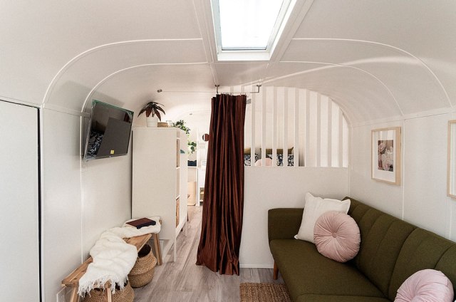 Hacia el otro lado de la caravana, después de la zona de estar, encontramos el dormitorio. Se separa sencillamente a través de unas cortinas. Cuando estas se cierran, la zona de la cama queda ventilada gracias a que a los pies de la cama, se ha resuelto con una celosía a modo de separador de ambientes, de tal manera que dejas que transpire el dormitorio y que entre algo de luz. Además, se ha habilitado gran cantidad de espacio para el almacenaje, tanto bajo la cama como con estanterías para guardar ropa, libros, etc.