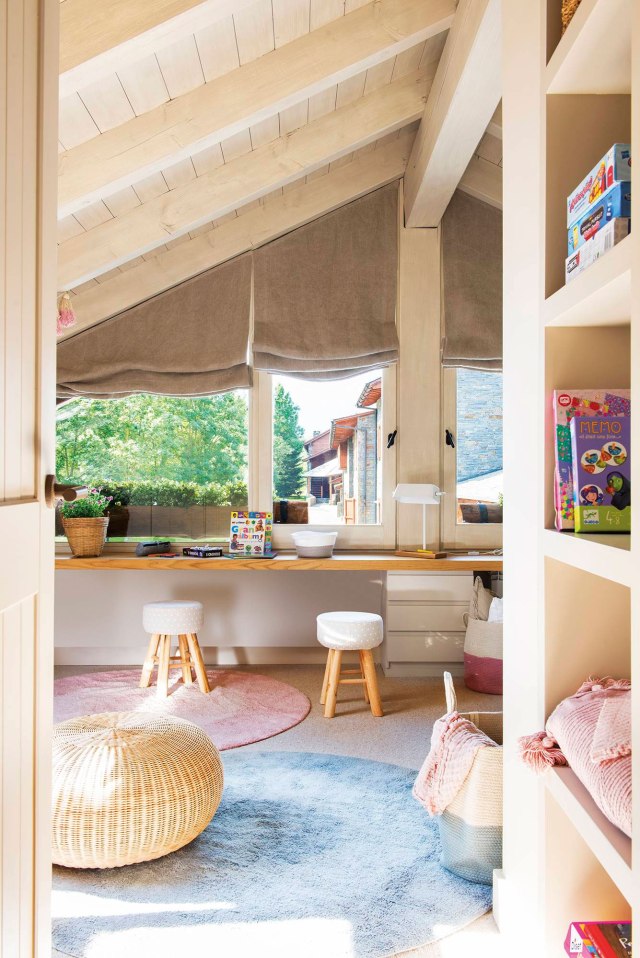 El papel pintado hace de conexión entre las dos plantas, vistiendo las escaleras. La alfombra del dormitorio principal, de la que me he enamorado, es de IDdesign y el banco, como muchas de las piezas de la casa de Sacum. No sé si dormir bajo una ventana Velux es para mí lo mejor, porque me despierto con cualquier pequeño ápice de luz, pero puedo imaginar lo que debe ser tumbarse cada noche en esa cama y ver las estrellas, lo más.