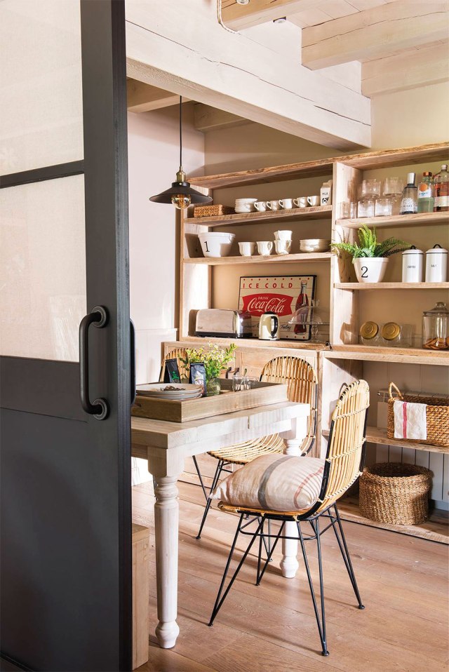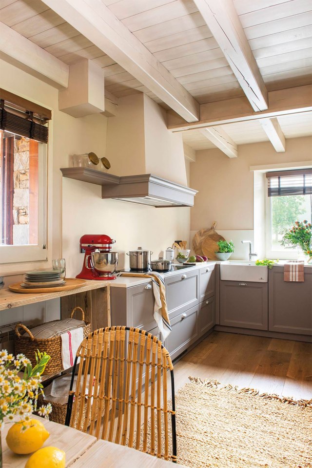 Si os fijáis tras el comedor hay un cerramiento, algo similar a un «mudroom» donde dejar abrigos, botas, etc. cuando llegas del campo. Ese espacio no existía como tal, sino que el recibidor era tan grande que decidieron cerrar por la parte de la cocina para poder tener un office. Ahora pueden disfrutar de una zona de entrada, de un comedor en el salón y detrás del panelado que se hizo en el mudroom donde está el banco, ahora está la cocina completa con office (todo eso era el antiguo recibidor, menudo desperdicio). El mobiliario de la cocina, que en este caso sí se quiso hacer más campestre, es de Cuines i banys Prisma, aunque se realizó con un acabado en gris muy actual.