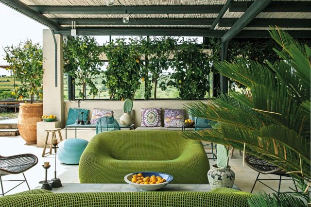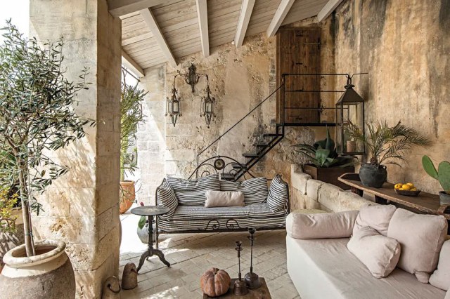 El exterior disfruta de varias terrazas, porches, un mirador con vistas al Mediterráneo, piscina, solárium, patios cubiertos,… donde podemos ver un mix de culturas, pasado y presente, mobiliario de firmas tan contemporáneas como el sofá verde de Paola Lenti o las tumbonas y sombrillas de Kettal, que se ven delimitadas por grandes columnas clásicas que nos recuerdan la impronta de su pasado. Por otro lado, encontramos también piezas singulares que rompen y ponen el punto focal a una estancia, como la silla azul de la primera imagen, es portuguesa y fue restaurada por la diseñadora Draga Obradovic (sin duda una de mis favoritas de la casa). También muebles antiguos recuperados, como el sofá de forja de la segunda imagen o los apliques de la pared. Y en esa misma estancia, los farolillos, traídos de Marruecos.