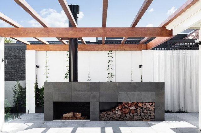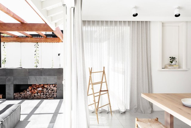 La plena conexión interior-exterior permite disfrutar de las mismas estancias en simetría según cada estación del año. En invierno acompañados del calor que encontramos en el pequeño salón con la chimenea. En verano con la piscina que ocupa un lugar central en la terraza, una amplia zona casi clónica de la zona de día.