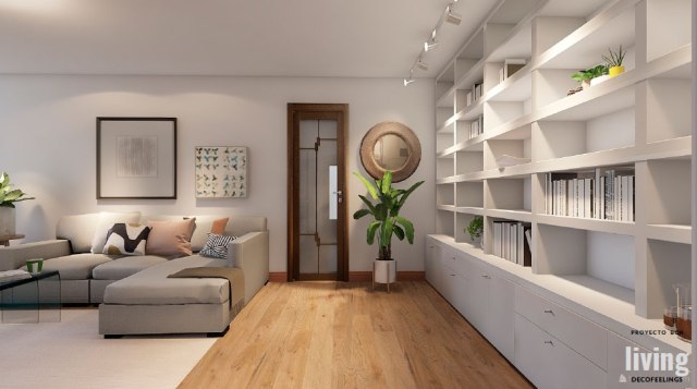 Todo el hogar tiene la madera natural como eje que sostiene el equilibrio de la comunicación familiar, desde los pavimentos que entrelazan todas las estancias, hasta los detalles donde se crean las atmosferas de conexión familiares: la pared de la sala de estar, la barra y la mesa de la cocina y las estanterías del despacho.