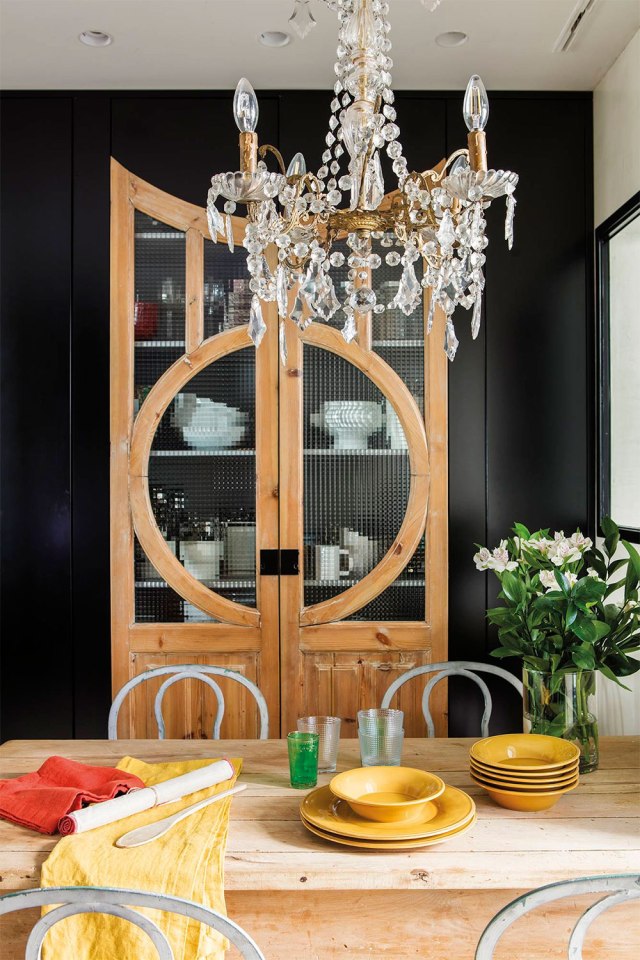 En la casa se recurre a los continuos contrastes, un ejemplo claro es la antigua lámpara de araña de la cocina junto a la estructura metálica que se ha utilizado como cerramiento en la misma estancia. O las puertas utilizadas en el armario de la habitación infantil, son de los años 30 y se recuperaron de una casa anterior, contrastan con el toque desenfadado de las fibras naturales de la alfombra. En el baño también se ha jugado con las mezclas, por un lado un gran espejo antiguo dorado preside el espacio, rompe su estética la grifería negra de corte moderno, un mueble de madera pintado que si me dicen que ha sido recuperado de una cocina, me lo creería, y por último la estancia se ha revestido con microcemento. Revestimiento práctico donde los haya y por el que suspiro desde hace años. Otro inciso por si buscáis una buena empresa que realice proyectos con este material, os recomiendo a Futurcret.