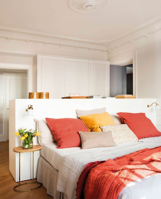 Y para ejemplo de piso repleto de pinceladas en esta tonalidad, el que os traigo hoy. Se trata de una antigua vivienda en Zaragoza, que fue sometida a una reforma integral por la arquitecta Sylvia Preslar. De ella sólo se salvaron las maravillosas molduras originales de los años 50 del comedor y del dormitorio principal, elementos arquitectónicos que le dan gran carácter a la vivienda. Haciendo un inciso, si tenéis una casa nueva o no tan nueva, y sobre todo si tiene los techos altos, podéis acudir a Orac Decor, si os apetece tener molduras en casa. Da igual que busquéis diseños antiguos o modernos, porque su catálogo es infinito (desando estoy de que llegue la edición de este año de Casa Decor para ver con qué nos sorprenden).